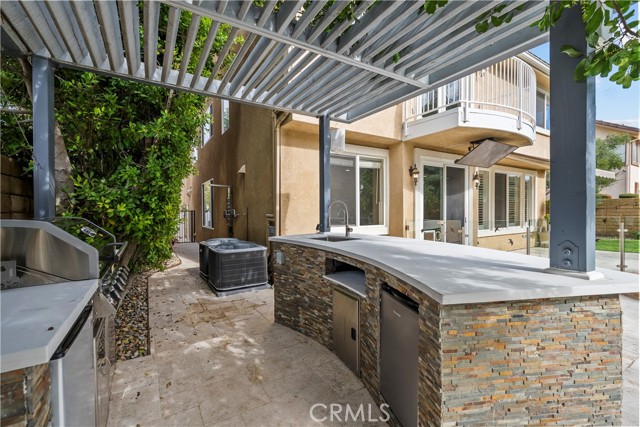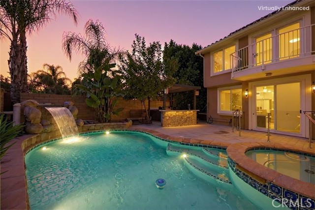 Welcome to this updated 4-bedroom, 3.5-bath pool home located in one of Porter Ranch’s most desirable gated communities, Villagio. This beautifully updated residence combines luxury, comfort, and timeless style. The elegant double-door entry welcomes you with a stone walkway and charming front courtyard. Inside, you’ll find rich wood-like flooring, plantation shutters, and freshly neutral colored paint throughout. The formal living room offers a dramatic two-story ceiling with abundant natural light pouring through large windows. The gourmet kitchen features quartz countertops & island, white cabinetry, glass tile backsplash with pot filler, stainless steel appliances, walk-in pantry, and breakfast nook. The inviting family room showcases newer carpet, a cozy upgraded fireplace with marble surround, and white open cabinetry. Upstairs includes Jack and Jill bedrooms with an updated bathroom, an en suite bedroom, and a versatile office or optional 5th bedroom with french doors. The luxurious primary suite features dual walk-in closets, dual sinks, a fully remodeled bathroom, and french doors leading to a private balcony with beautiful mountain views. Offering approximately 3,117 sq. ft. of living space on a prime 7,331 sq. ft. lot with a 3-car garage. Nearly $200,000 in upgrades include a complete backyard redesign and landscaping, solar panels and pool solar system, electric vehicle charger, new garage door, cabinets, and flooring, remodeled bathrooms, new laundry room flooring, new stair banister, under-stair storage, attic build-out, retractable shade covers for windows and patio, upgraded dimmable recessed lighting, artificial turf in the front yard, two new A/C units, and a tankless water heater. Enjoy your private entertainer’s backyard featuring a sparkling pool and spa, grassy play area, updated built-in BBQ island, and tiled patio, perfect for gatherings or relaxing evenings outdoors. Located near scenic hiking trails, parks, and top-rated schools including Porter Ranch Community School and Castlebay Lane Charter. Conveniently close to the 118 Freeway, as well as shopping and dining at The Vineyards and Porter Ranch Town Center. This is a rare opportunity to own a beautifully upgraded pool home in one of Porter Ranch’s premier communities.