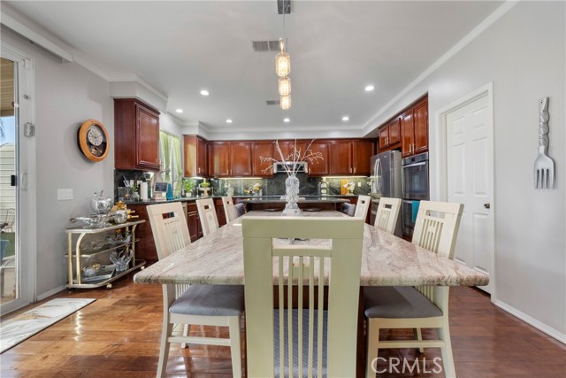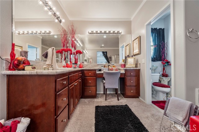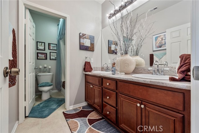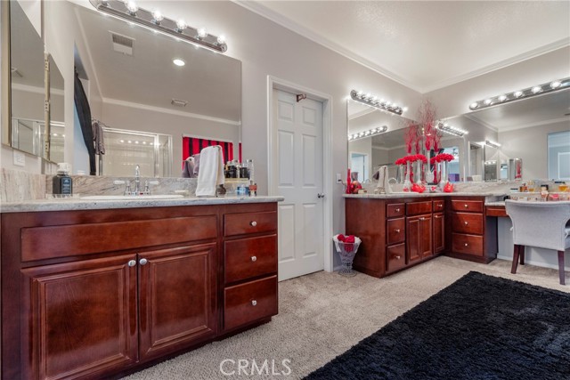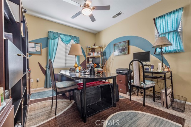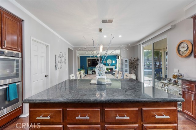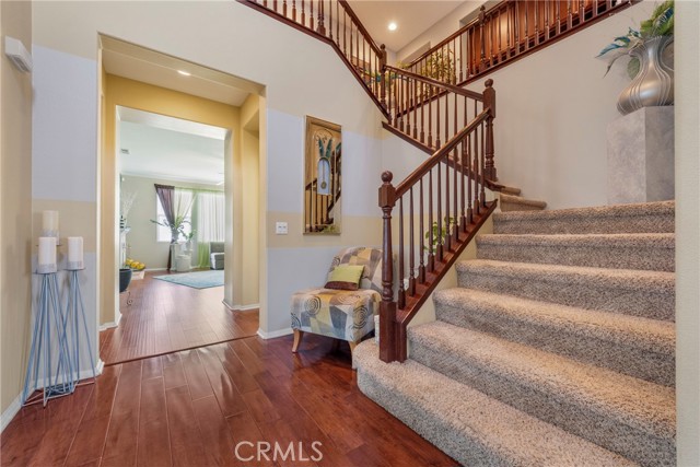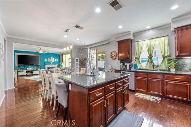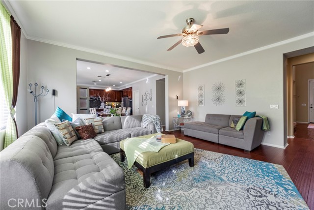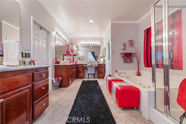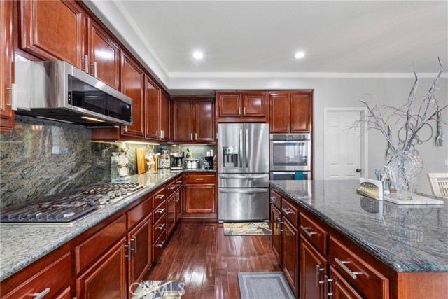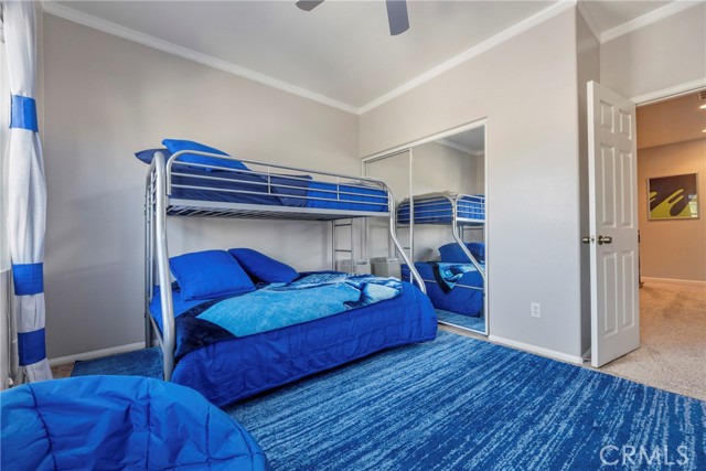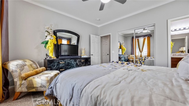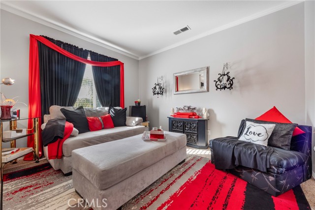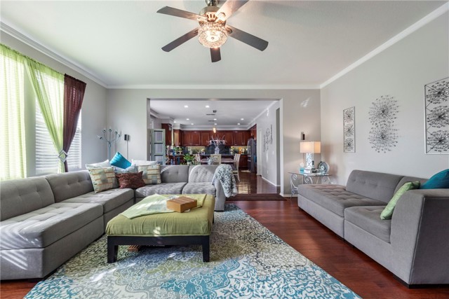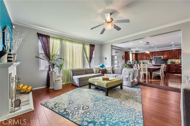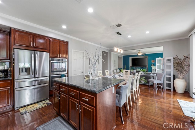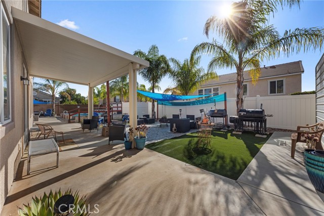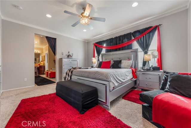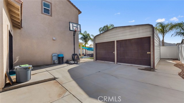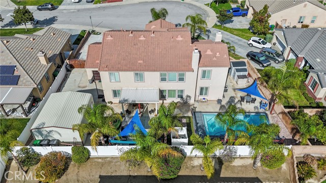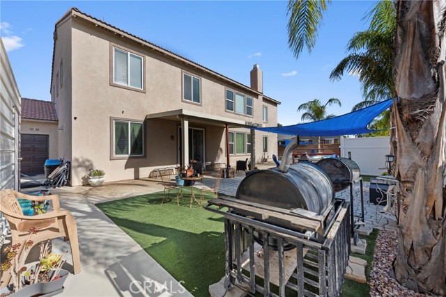 Welcome to your dream home nestled in a quiet cul de sac in one of Moreno Valley’s most desirable neighborhoods. This stunning two story residence showcases exceptional craftsmanship and thoughtful upgrades throughout, offering an ideal blend of luxury, comfort, and functionality. Step inside and be greeted by an elegant formal living room with a fireplace, a spacious dining area, and an inviting family room perfect for gatherings. The first floor features a private guest suite with a full bath, a convenient powder room, and a beautifully appointed butler’s pantry. The chef’s kitchen shines with newly installed stainless steel appliances, granite countertops, a generous walk in pantry, and a massive custom granite island affectionately known as “the continent” that serves as the centerpiece for entertaining. Crown molding and remote controlled ceiling fans accent every room with refined detail. Upstairs, the luxurious owner’s suite offers a private retreat complete with a relaxing sitting area, a spa inspired jacuzzi bathtub, a separate shower, and an oversized walk in closet. Granite counters elevate every bathroom, while the upstairs laundry room provides added convenience. An additional bedroom with its own private bath plus two more bedrooms with a shared hall bath complete the upper level. Outdoors, enjoy a beautifully landscaped front yard with a full sprinkler and drip irrigation system. The backyard is an entertainer’s paradise with a sparkling pool featuring waterfalls, custom decking, multiple seating areas, and low maintenance artificial turf. All fencing has been newly replaced with premium vinyl for lasting beauty and privacy. Additional features include a home security system with exterior cameras, a three car garage with a custom two car shed, and ample parking for RVs, boats, or motorhomes. The property provides enclosed parking for up to five vehicles and additional exterior parking for approximately ten. A rare combination of elegance, space, and resort style living, this remarkable home truly has it all.