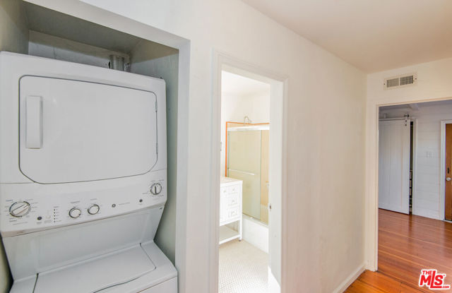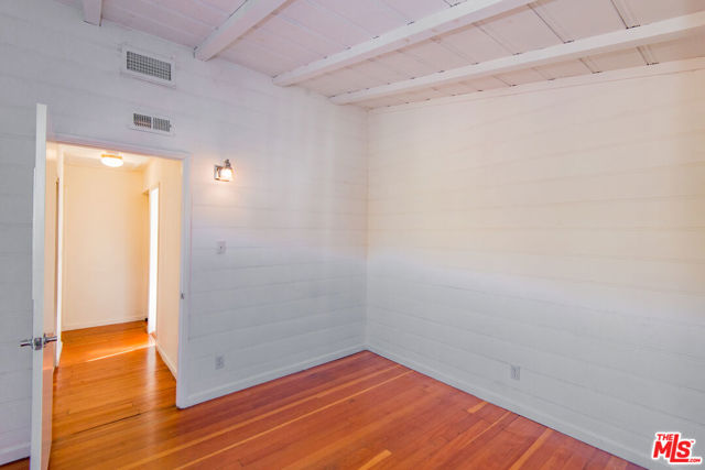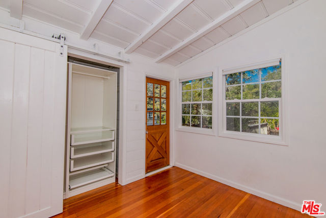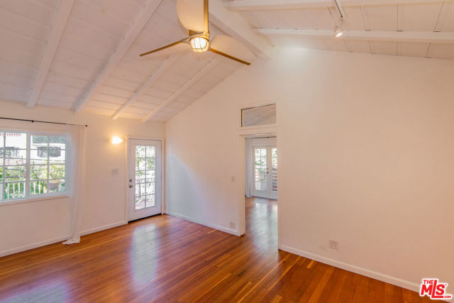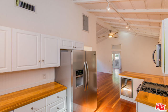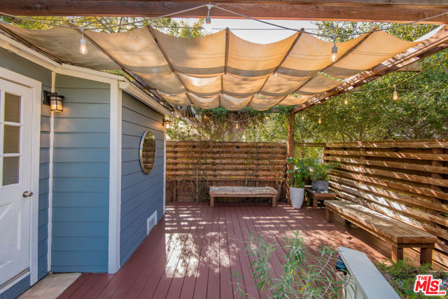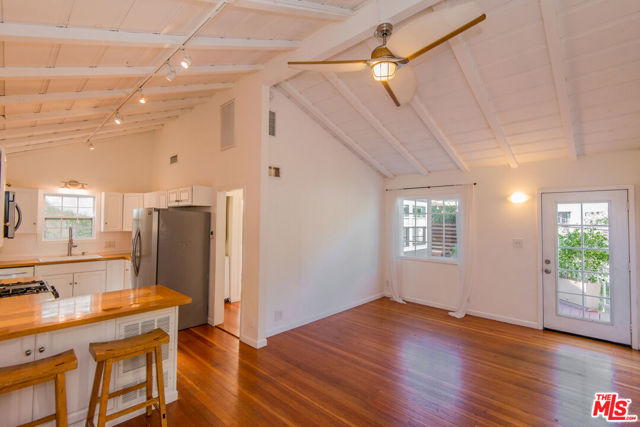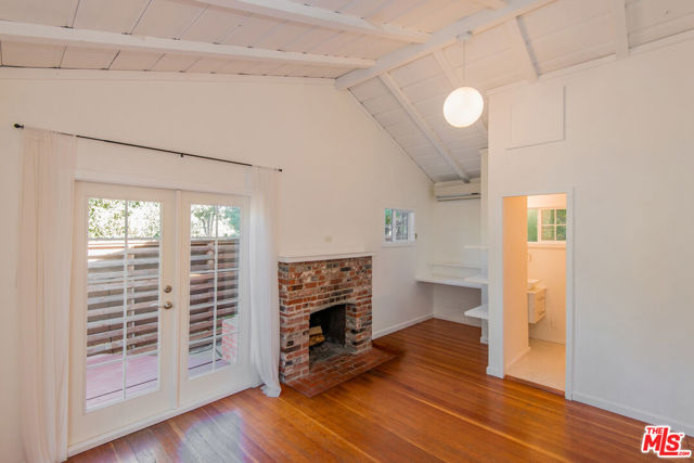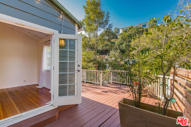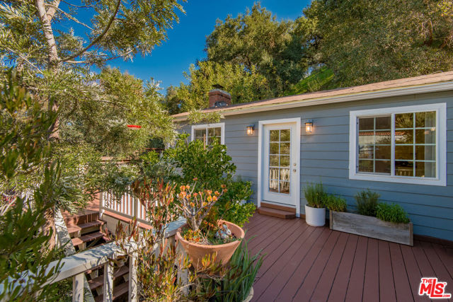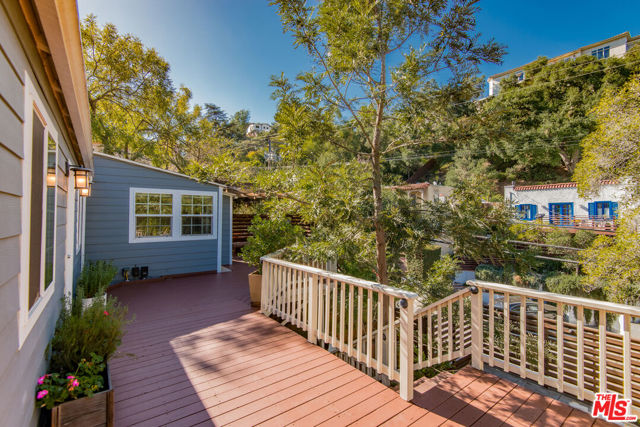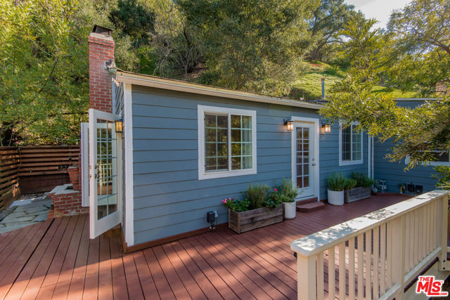 Tucked away in the heart of Laurel Canyon on storied Lookout Mountain Avenue, this light-filled 2-bedroom, 2-bath cottage blends classic canyon charm with modern comfort. Set behind lush greenery, the home welcomes you with vaulted beamed ceilings, rich hardwood floors, and an open layout that combines warmth and functionality. The bright kitchen features butcher-block countertops, stainless steel appliances, and a cozy breakfast bar that opens to the living area perfect for relaxed entertaining. French doors from both the living room and primary bedroom open to an expansive wraparound deck, creating a seamless indoor-outdoor flow ideal for morning coffee or evenings under the stars. A brick fireplace anchors the primary suite, complete with built-in shelving and direct deck access. The secondary bedroom offers tree-top views and easy access to the updated hall bath. Additional highlights include a washer/dryer, central HVAC, a detached two-car garage with a rooftop terrace, and a private outdoor tub and shower tucked into the trees for a true canyon-living experience. Surrounded by trees and tranquility, yet just minutes from Sunset Boulevard, this Laurel Canyon retreat sits within the award-winning Wonderland School District and embodies the essence of canyon living private, soulful, and inspiring.