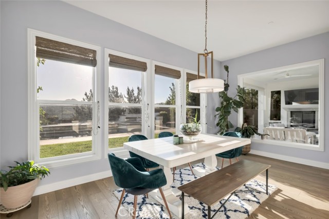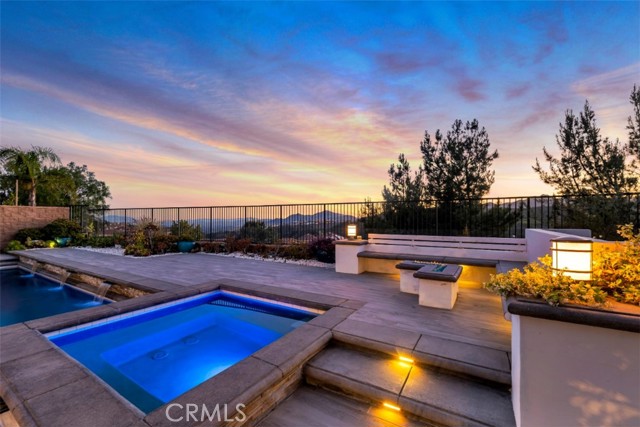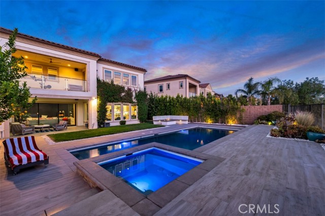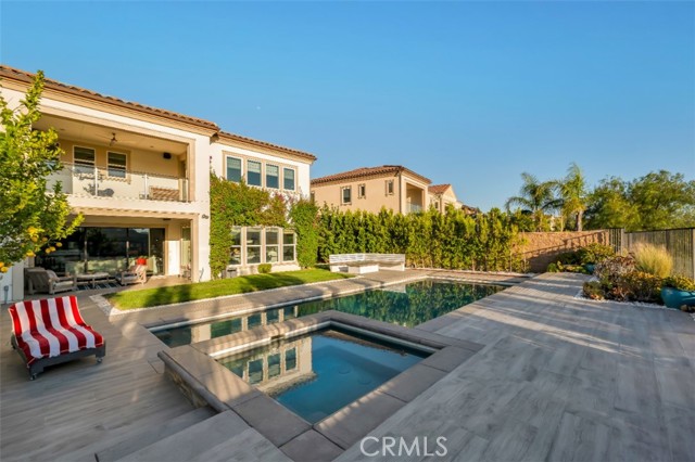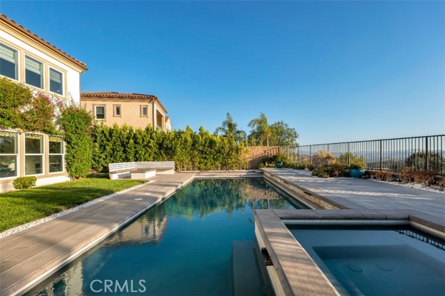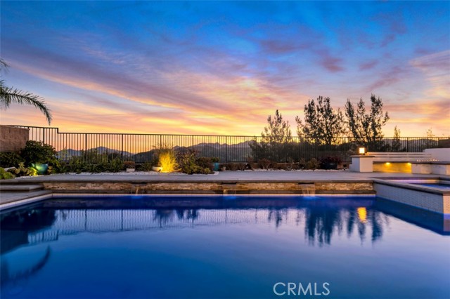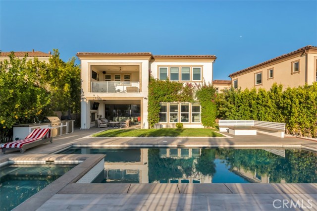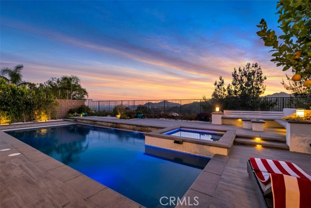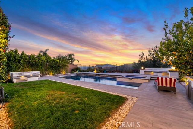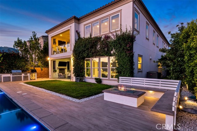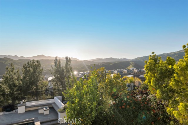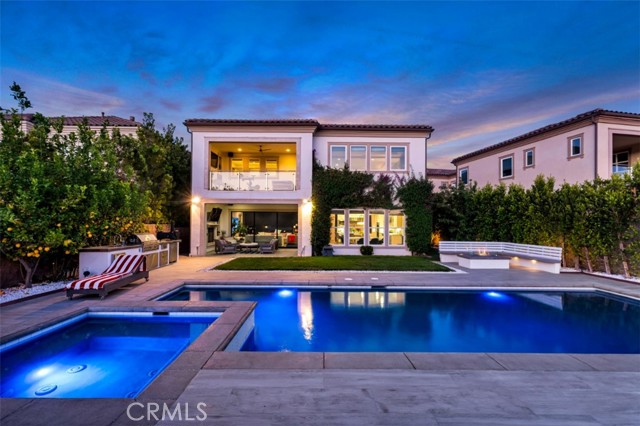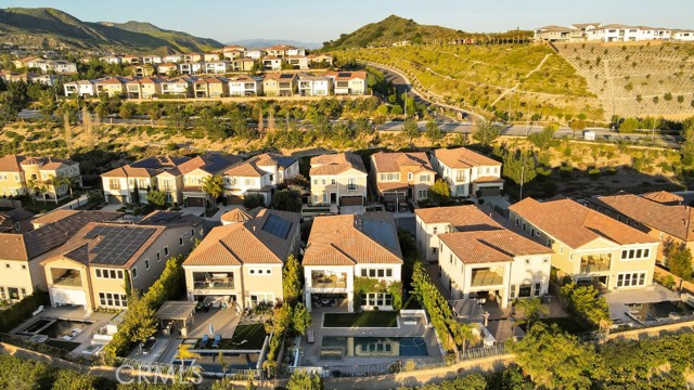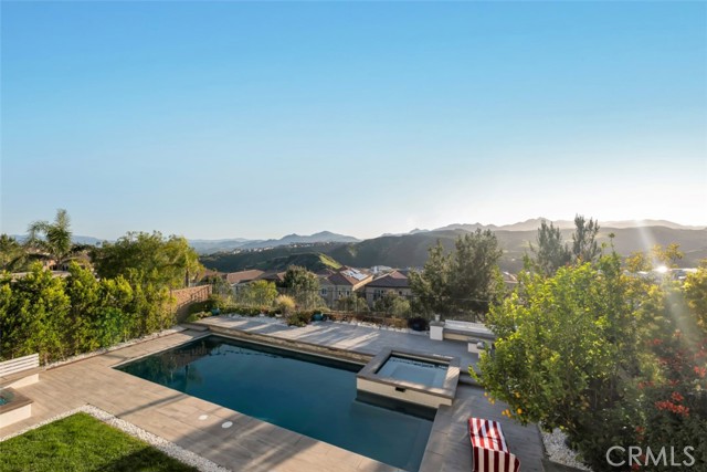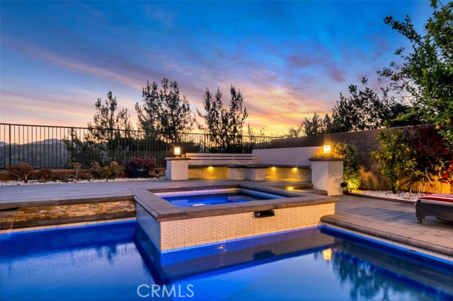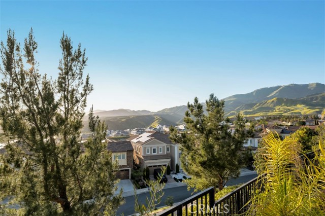 Experience exceptional luxury & panoramic mountain & city light views in this meticulously appointed 5 bed, 5.5 bath, nearly 4K sq ft residence located in the prestigious guard-gated community of Bella Vista, Porter Ranch. Showcasing high ceilings, recessed lighting, built-in speaker system, & engineered wood flooring throughout, this home blends refined design w/ modern convenience including energy efficient, owned, solar panels, tankless water heater, & dual zone AC! Formal entry opens to 2-story foyer w/ elegant, curved staircase on 1 side, & beautiful formal dining room w/ tray ceiling on the other. Butler’s pantry connects seamlessly to a wonderful jewel of a kitchen, truly a chef’s dream, complete w/ walk-in pantry, high-end, stainless-steel appliances, including six-burner range, double ovens, dishwasher, wine fridge, & central island w/ large farmhouse sink & breakfast bar seating. The kitchen anchors a spacious great room w/ wall of windows framing stunning backyard views, casual informal dining area, & a cozy family room area boasting oversized, tripartite glass slider out to a California room, that can be fully opened to enjoy indoor/outdoor living, w/ a fireplace, ceiling fans, & recessed lighting. 1 spacious bedroom w/ large walk-in closet & en-suite ¾ bath makes a perfect guest or Mother-in-law suite downstairs. Upstairs, the grand staircase leads to spacious loft/landing ideal as secondary living space, office, or playroom. Primary suite boasts high tray ceilings, sitting area, & private glass-railed balcony w/ ceiling fan, recessed lighting, & sweeping views. The en-suite bath offers quartz counters, dual vanities, dual walk-in closets, soaking tub & separate glass-enclosed shower. There are 3 additional, good-sized bedrooms upstairs; 2 w/ well-appointed, full-en-suite baths, 1 w/ a walk-in closet, 1 w/ a Juliet balcony & access to the full, hall bath. Additional features include a convenient upstairs laundry room & finished 3-car garage w/ direct access. The lush backyard is an entertainer’s paradise w/ 8 speaker Episode sound system including in ground bass speaker, a custom outdoor kitchen (featuring BBQ, fridge, sink, utility drawers, & side burner), sparkling pool w/ waterfall & spa, firepits w/ built-in seating, lemon tree, & open fencing to maximize the panoramic views. The community offers resort-style amenities, 24-hour security, & proximity to award-winning schools, fine dining, shopping, & all the best Porter Ranch has to offer.