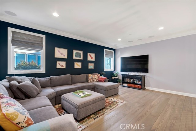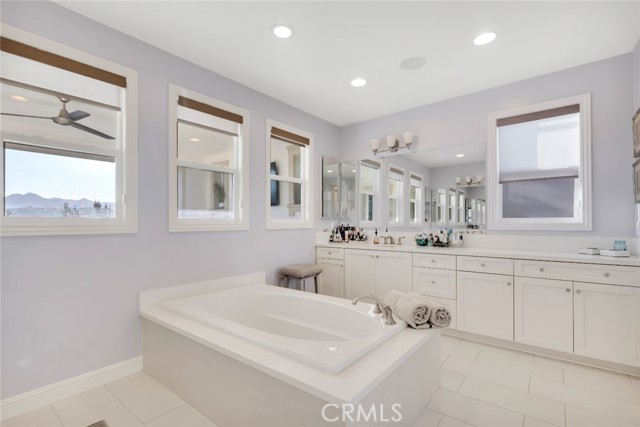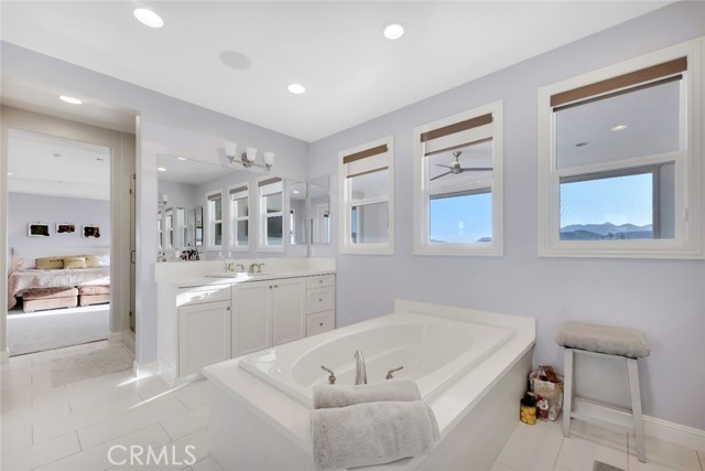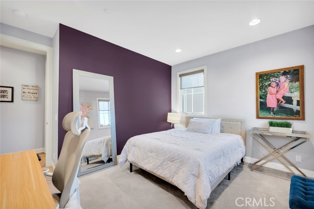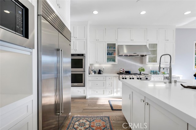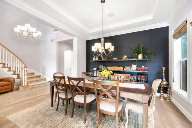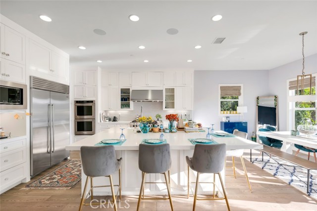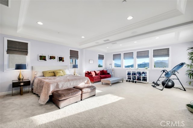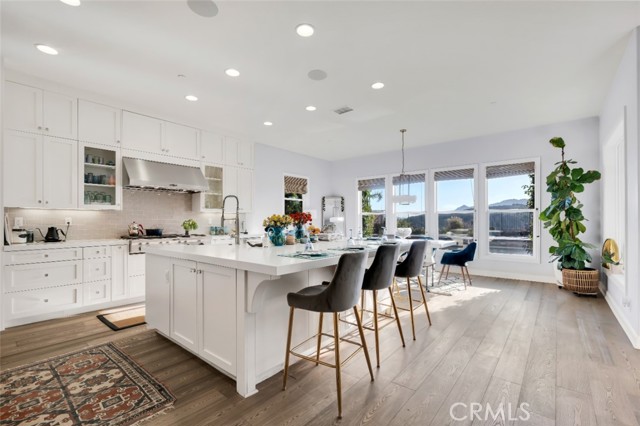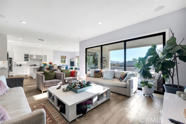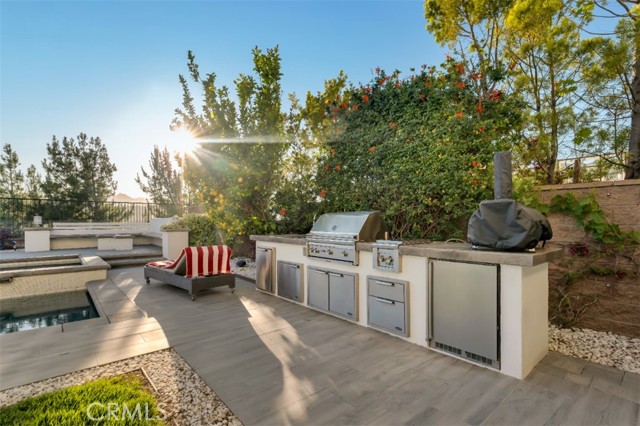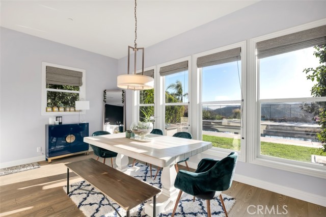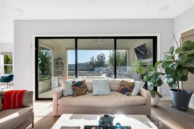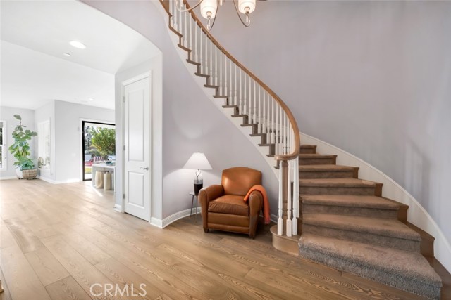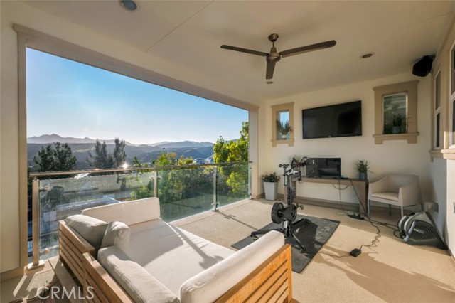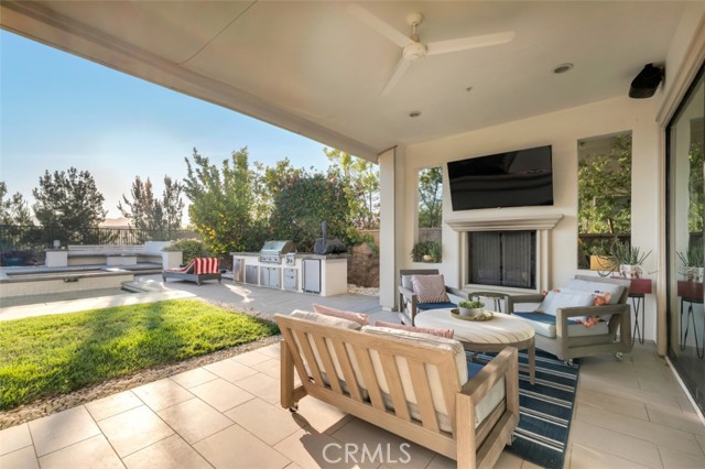 Experience exceptional luxury & panoramic mountain & city light views in this meticulously appointed 5 bed, 5.5 bath, nearly 4K sq ft residence located in the prestigious guard-gated community of Bella Vista, Porter Ranch. Showcasing high ceilings, recessed lighting, built-in speaker system, & engineered wood flooring throughout, this home blends refined design w/ modern convenience including energy efficient, owned, solar panels, tankless water heater, & dual zone AC! Formal entry opens to 2-story foyer w/ elegant, curved staircase on 1 side, & beautiful formal dining room w/ tray ceiling on the other. Butler’s pantry connects seamlessly to a wonderful jewel of a kitchen, truly a chef’s dream, complete w/ walk-in pantry, high-end, stainless-steel appliances, including six-burner range, double ovens, dishwasher, wine fridge, & central island w/ large farmhouse sink & breakfast bar seating. The kitchen anchors a spacious great room w/ wall of windows framing stunning backyard views, casual informal dining area, & a cozy family room area boasting oversized, tripartite glass slider out to a California room, that can be fully opened to enjoy indoor/outdoor living, w/ a fireplace, ceiling fans, & recessed lighting. 1 spacious bedroom w/ large walk-in closet & en-suite ¾ bath makes a perfect guest or Mother-in-law suite downstairs. Upstairs, the grand staircase leads to spacious loft/landing ideal as secondary living space, office, or playroom. Primary suite boasts high tray ceilings, sitting area, & private glass-railed balcony w/ ceiling fan, recessed lighting, & sweeping views. The en-suite bath offers quartz counters, dual vanities, dual walk-in closets, soaking tub & separate glass-enclosed shower. There are 3 additional, good-sized bedrooms upstairs; 2 w/ well-appointed, full-en-suite baths, 1 w/ a walk-in closet, 1 w/ a Juliet balcony & access to the full, hall bath. Additional features include a convenient upstairs laundry room & finished 3-car garage w/ direct access. The lush backyard is an entertainer’s paradise w/ 8 speaker Episode sound system including in ground bass speaker, a custom outdoor kitchen (featuring BBQ, fridge, sink, utility drawers, & side burner), sparkling pool w/ waterfall & spa, firepits w/ built-in seating, lemon tree, & open fencing to maximize the panoramic views. The community offers resort-style amenities, 24-hour security, & proximity to award-winning schools, fine dining, shopping, & all the best Porter Ranch has to offer.
