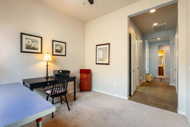 Mountain Views and Golf Course Living!Experience stunning southern views of Mt. San Jacinto and Mt. Gorgonio from this beautifully furnished Avalino floor plan in Sun City Shadow Hills. Perfect as a seasonal retreat or year-round residence, this 2-bedroom, 2-bath home with den/office offers comfort, quality, and resort-style living.The open kitchen features Corian countertops, double ovens, a gas cooktop, 42-inch cabinetry, a step-in pantry, and a breakfast bar overlooking the spacious great room ideal for gatherings and everyday living. Plantation shutters throughout add privacy and elegance, complementing the high ceilings and tasteful decor.The primary suite provides a relaxing retreat with dual vanities, a soaking tub, separate shower, and custom walk-in closet. A guest bedroom and den offer flexible space for visitors or a home office.Step outside to enjoy the ultimate in desert outdoor living. The elevated patio above the 12th green of the North Course features two new motorized 10-foot extendable awnings, a new outdoor L-shaped sectional, and five matching gliding chairs, creating the perfect setting for entertaining or relaxing. The fire pit and alfresco dining area make this space ideal for both cool winter evenings and sunny summer days.This turnkey home captures the essence of desert living refined, comfortable, and perfectly situated in the heart of Sun City. Sun City Shadow Hills offers two championship golf courses, resort-style clubhouses, state-of-the-art fitness centers, pools, tennis and pickleball courts, and an abundance of social clubs and activities for the desert lifestyle.