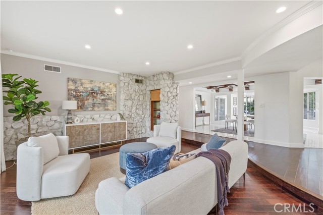 Nestled above Rinaldi near Knollwood Country Club, this 3-bedroom, 3-bath home (with an additional recreation room) offers 2,790 sq. ft. of open living space, a rare 1,398 sq. ft. garage, and a sprawling 18,535 sq. ft. lot — combining classic 1960s architecture with a sense of comfort and possibility Inside, a light-filled open floor plan connects multiple living areas, ideal for both relaxed everyday living and effortless entertaining. The formal living room impresses with cathedral ceilings, floor-to-ceiling picture windows, and a traditional brick wood-burning fireplace, creating a dramatic yet inviting centerpiece. The kitchen offers a cozy breakfast nook, a convenient laundry area, and direct access to the backyard for easy indoor-outdoor flow. Step outside to an entertainer's yard, complete with a sparkling pool, an enclosed patio room, and a detached recreation room — perfect for a pool house, home office, gym, or creative studio. A spacious garage spanning nearly 1,400 SF provides generous parking and storage, easily accommodating multiple vehicles, RVs, or boats, with room to spare for a workshop or fitness. The garage area can also be ideal for an ADU. Experience the tranquility of the Knollwood lifestyle — surrounded by mature greenery, open skies, and the prestige of Country Club living.