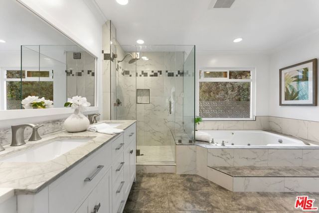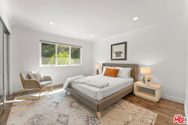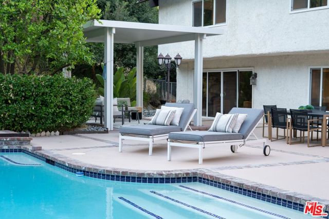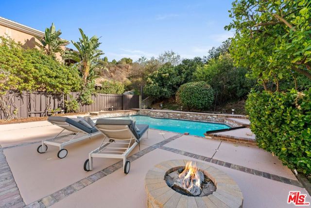 Escape to your private paradise! Tucked on a serene Woodland Crest cul-de-sac, this stunning 5-bed, 4-bath pool home sits on over an acre! 3,256 sq ft of luxury on a sprawling 26,042 sq ft lot, nature visible from every window! Slide open the doors to California dream living: a resort-style backyard with sparkling recently refinished pool, chic gazebo, and a bar that opens straight into the gourmet kitchen, your epic housewarming bash starts here! Also a side yard perfect for a children's play area or work-out area. Inside, sleek wood laminate & Italian tile floors, Jenn-Air appliances, and designer lighting. Not one but two primary suites, one with it's own sitting room, a cozy fireplace, private balcony, and custom walk-in closet. Eco-smart? Paid-off 2022 solar panels! Dive into the freshly re-plastered, retiled pool under the new gazebo perfect for al fresco feasts. Plus, brand-new 2020 central AC/heat. Just minutes from The Village, Malibu's iconic beaches, and top-rated Woodland Hills Elementary. Your ultimate private oasis awaits.