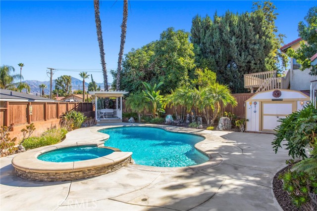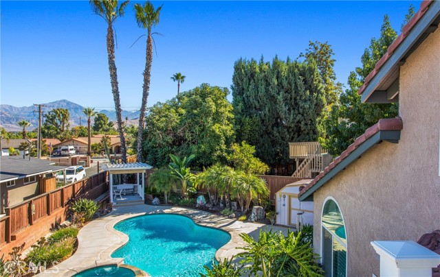 Turn-key pool & spa home in one of Redlands’ most sought-after neighborhoods! This impeccably maintained 4 bedroom, 2.5 bath home sits on a quiet, low-traffic street across from peaceful greenbelt space and features a beautifully landscaped 9,800 sq.ft. lot. Homes in this area rarely become available, and this one is truly move-in ready—simply unpack and enjoy.** A welcoming foyer and elegant staircase lead to the spacious primary suite with a private balcony, plantation shutters, ceiling fan, and an updated ensuite offering a double-sink Corian vanity, soaking tub, glass-enclosed shower, and walk-in closet. Down the hall are three additional well-sized bedrooms, each with plantation shutters and ceiling fans. One is currently used as an office and includes quality wall-to-wall built-ins. The updated hall bath also features Corian counters and modern finishes. The lower level offers warm, comfortable living spaces designed for everyday life and entertaining. The separate family room includes a cozy fireplace and built-in surround sound system. Formal living and dining rooms fill with natural light through plantation shutters. The well-appointed kitchen features Corian countertops, newer appliances, recessed lighting, and a convenient breakfast bar with seamless flow to the dining area and backyard. Step outside to your private resort-style yard. The perfectly manicured 9,800 sq.ft. grounds offer a **saltwater pool & spa**, covered patio with two ceiling fans, low-maintenance turf, tranquil water features, drip irrigation system, gazebo, two storage sheds, and beautiful mountain views. This exceptional outdoor space is ideal for gatherings, relaxation, and year-round enjoyment. Thoughtful upgrades provide comfort and peace of mind, including energy-efficient windows, upgraded HVAC, roof improvements, updated flooring, newer lighting and ceiling fans, and a custom front door. Every detail reflects pride of ownership and long-term care. Located within the **Redlands Unified School District** and close to shopping, dining, parks, medical facilities, and commuter routes, this home offers both convenience and lifestyle appeal. A rare opportunity to own a truly move-in-ready property on a beautifully maintained lot in one of Redlands’ most desirable neighborhoods. Don’t miss your chance—homes of this quality do not last!