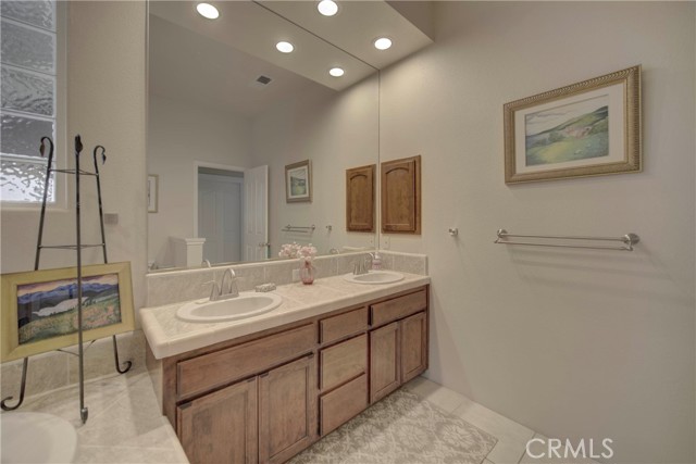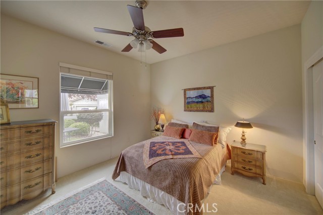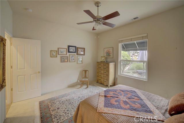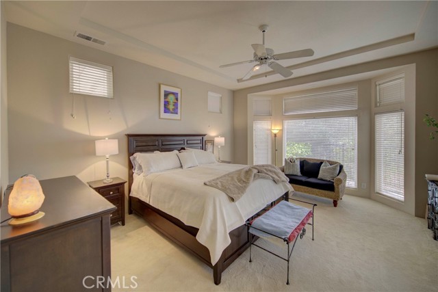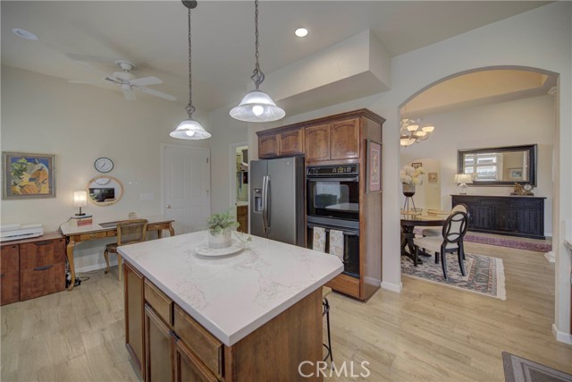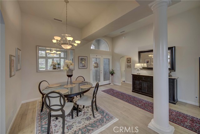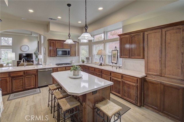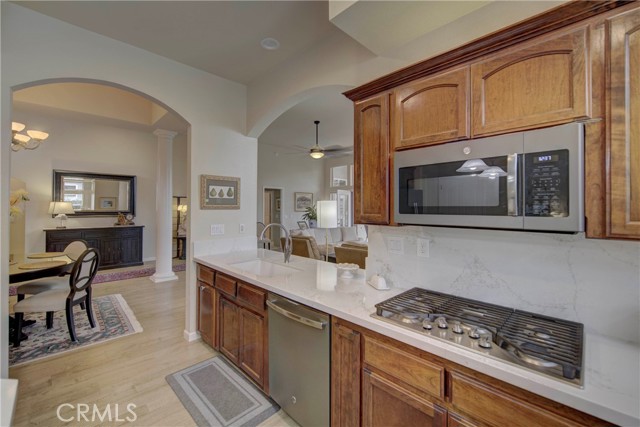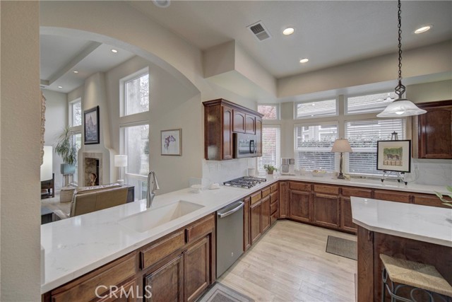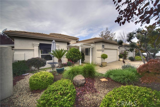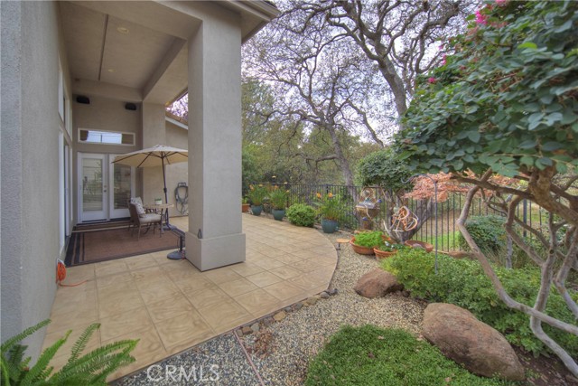 Welcome to 732 Serrano Ct — Your Canyon Oaks retreat! Nestled in the prestigious gated community of Canyon Oaks this stunning home sits within the desirable Arroyo Greens subdivision. From the moment you arrive, you’ll appreciate the high-end, low-maintenance landscaping, thoughtfully designed with lavender, butterfly bushes, maples, and citrus trees. A charming covered arbor beautifully frames the front entrance, setting the tone for the elegance inside. Step through the front door and you’re greeted by soaring ceilings, newer vinyl plank flooring, and a bright, open floor plan that seamlessly connects the living room, dining area, and kitchen. The great room features a cozy gas fireplace and floor-to-ceiling windows that fill the space with natural light and views of the lush outdoors. The chef’s kitchen is as stylish as it is functional, showcasing white quartz countertops, rich cherry cabinetry, GE appliances, double ovens, an island, and a five-burner gas stove with a micro-hood—perfect for hosting or everyday cooking. The primary suite is your private sanctuary, complete with cathedral ceilings, dual closets (including a walk-in), and French doors that open to the serene backyard. The en suite bathroom offers dual sinks, a soaking tub, and a tiled walk-in shower—the ideal space to unwind. On the opposite wing, you’ll find two spacious guest bedrooms and a full bathroom, providing comfort and privacy for family or guests. Step outside through one of the three sets of French doors to a covered patio overlooking a seasonal creek and the Canyon Oaks golf course. The meticulously landscaped yard offers a peaceful setting for morning coffee, evening wine, or entertaining friends—all with breathtaking sunset views. Additional highlights include a two-car attached garage with an insulated door and owned solar (installed in 2022) that covers all your energy needs. It’s time to experience the relaxed luxury of country club living at Canyon Oaks—where every day feels like a getaway.