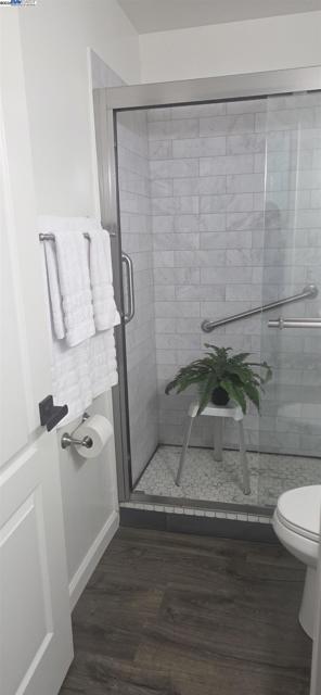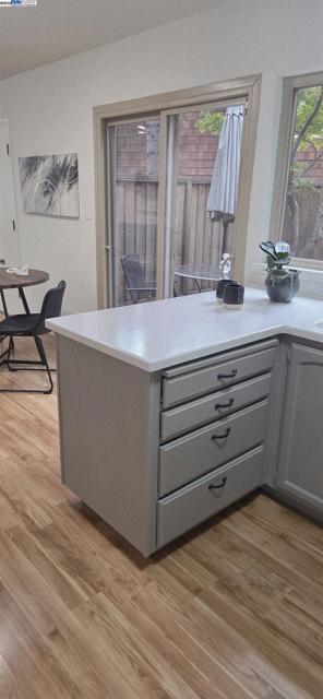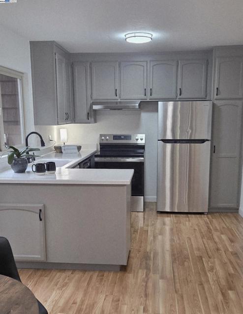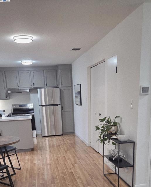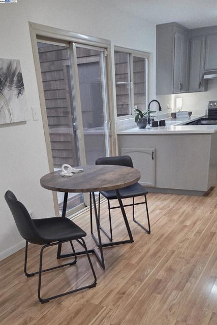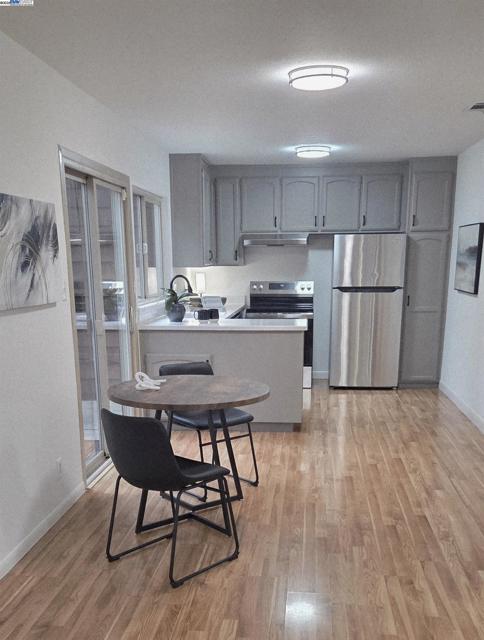 Marvelous move-in ready 2 bedroom, 1 bath Condominium. Single story end unit. Only one shared wall and no one above. No stairs level-in entry. Located in a lovely complex with mature landscaping and abundant trees. Close to I-580, BART and in the highly rated Castro Valley school district. Easy access to downtown Castro Valley shops and restaurants including the new Mei Mei Market. Two dedicated parking spaces (one covered) near the front of the unit. New carpet in living room and bedrooms. Bath, dining and kitchen have easy care wood-look vinyl flooring. Freshly painted inside. Kitchen has all new SS appliances. Bathroom has a walk-in shower. Dual pane windows, newer furnace, AC, smart thermostat and ceiling fans keep things comfortable year-round. In-unit laundry with full size washer and dryer to stay. Fully fenced patio with large storage closet. Pet friendly complex.