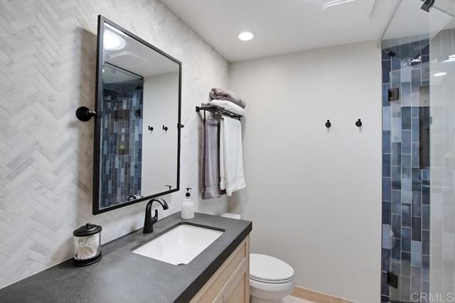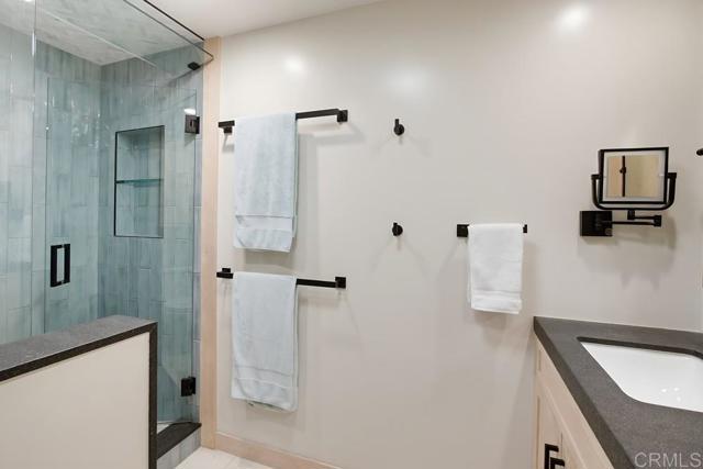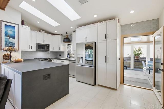 Prepare to be WOWED!!! Welcome to an exceptionally upgraded coastal residence in the highly sought-after community of The Cape. Set on one of the largest end parcels in the neighborhood, this beautifully reimagined home blends refined craftsmanship, modern comfort, and thoughtful design throughout. Inside, custom solid maple doors, baseboards, and casings frame every room with timeless warmth. Elegant limestone tile flooring flows seamlessly through the home, complemented by custom maple cabinetry and elevated 38” kitchen and bathroom counters for a comfortable working height and added storage. Premium LG Signature Series appliances, a natural gas range, and a matching outdoor pass-through counter create a cohesive, chef-inspired cooking experience. Both bathrooms feature custom-tiled showers with tight-sealing glass doors that can double as steam showers, solar tube lighting with night lights, and luxurious fixtures including a lighted make-up mirror in the primary suite. Each bedroom offers built-in closets, while the guest suite adds a Murphy bed and custom office workspace. The home also includes a built-in garage shelving system and a fire- and waterproof in-slab safe. Enjoy year-round energy efficiency with a 20-panel solar system that zeros out the electric bill, a high-performance two-stage Trane HVAC system, and a Navien tankless water heater—all city-permitted and professionally installed. Additional storage abounds with a lighted 150 sq.ft. attic and pull-down access. Step outside to an entertainer’s dream: 495 sq.ft. of covered patio living space with a complete outdoor kitchen—featuring a Bull 6-burner grill with rotisserie, Bull 3-burner griddle, KitchenAid beverage fridge and clear-ice maker, sink with hot/cold water, garbage disposal, and separate RO drinking tap. A flip-out pass-through window connects the indoor and outdoor kitchens under a continuous matching countertop. Relax in the 9’x9’ Dimension One Meridian spa or on the 350 sq.ft. ocean-view deck (90% complete, city and HOA approved). A dog-washing station with hot and cold water adds a touch of everyday convenience.This home offers the rare combination of privacy, craftsmanship, and coastal Carlsbad living—just minutes from beaches, shops, and restaurants. A true turnkey residence unlike any other in The Cape.