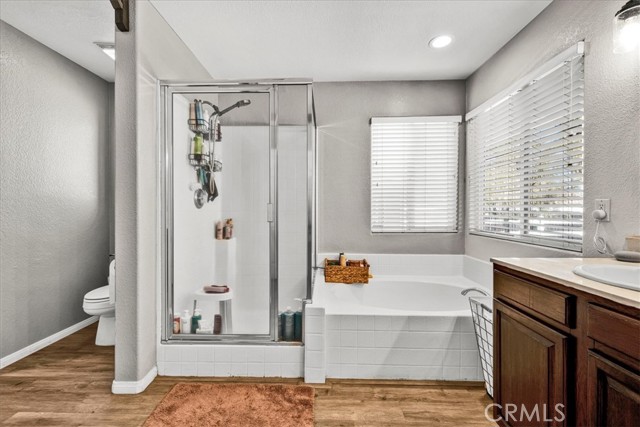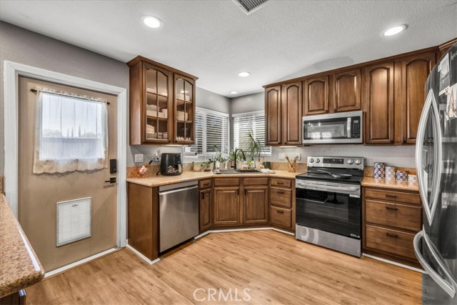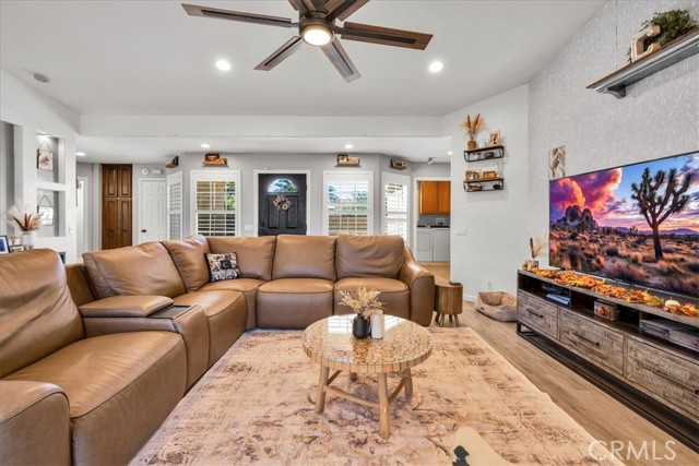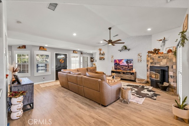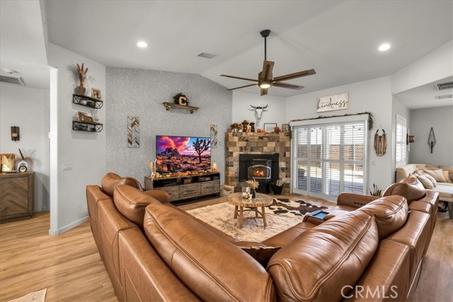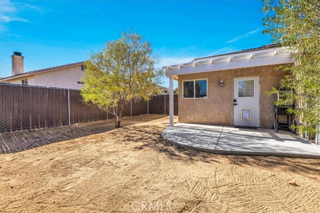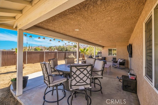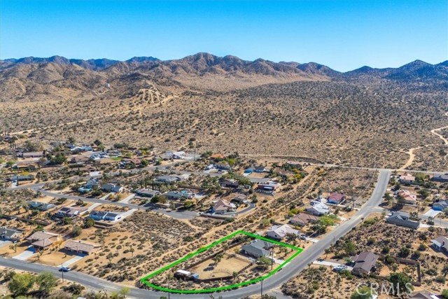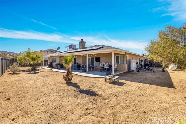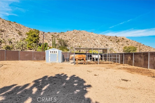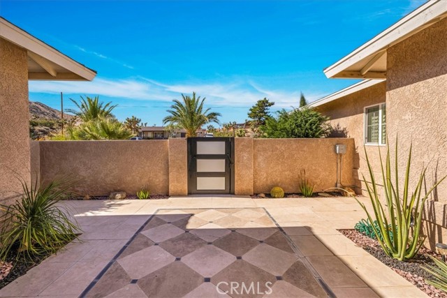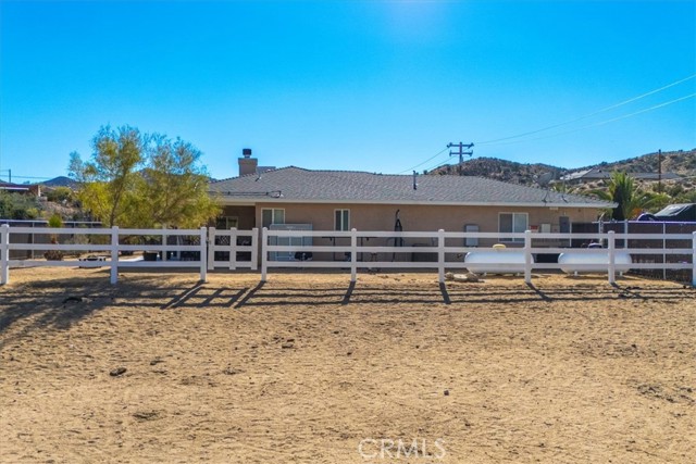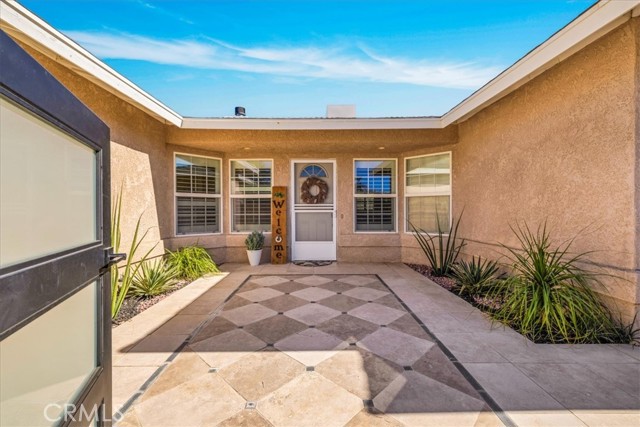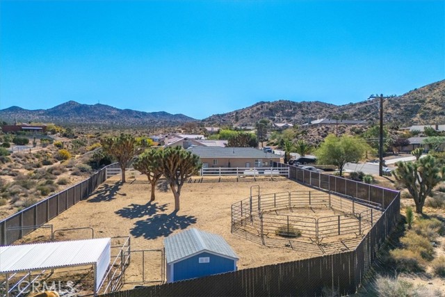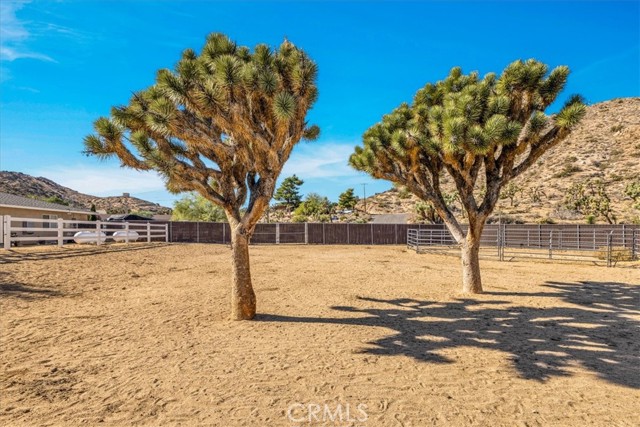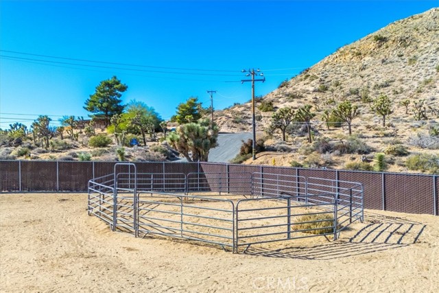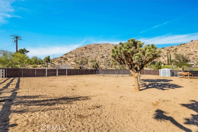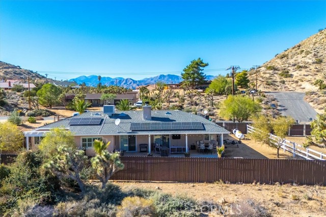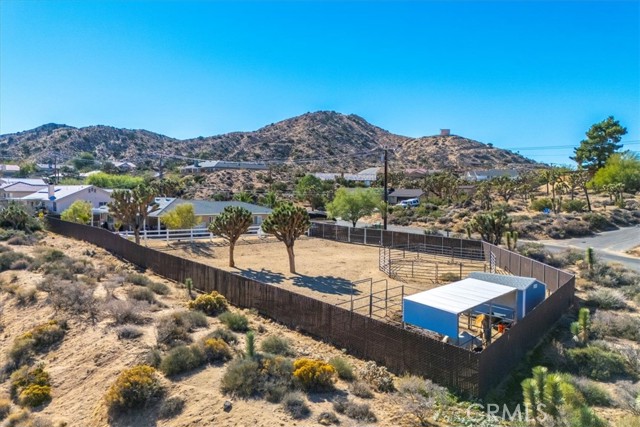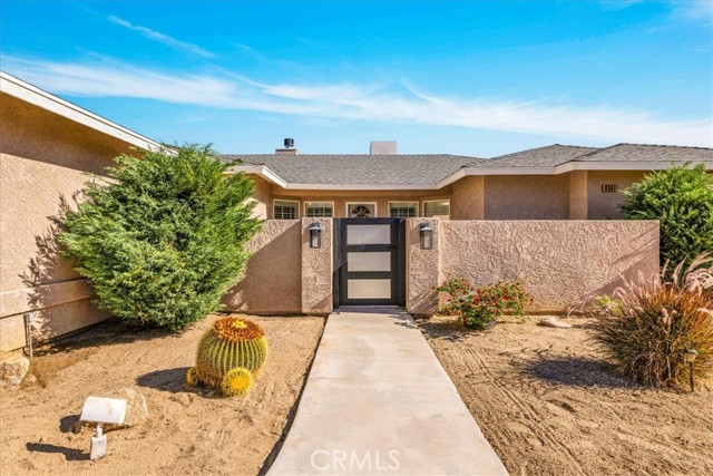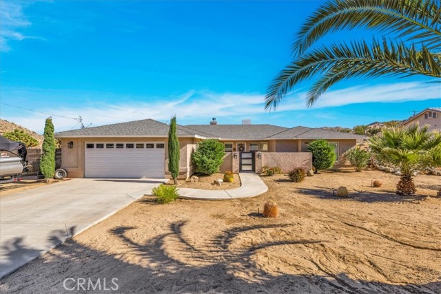 Welcome to 8367 Elk Trl, a beautiful 3 bedroom 2 bath Horse Property located in the highly desirable Juniper Terrace neighborhood of Yucca Valley. This wonderfully maintained property includes an additional Corner Lot (APN 0585-542-04) totaling 1 ACRE of Land (fully fenced)! The additional lot is complete with water, a horse corral, round pen and storage shed. When you arrive you'll pass through a charming courtyard & enter into the main living space which boasts high ceilings with recessed lighting, warm wood-like flooring, a lovely wood-burning pellet stove fireplace and the large north facing windows let in an abundance of natural light. This home's modern style and open-concept layout with a split-floor plan is one to be desired. Just off the living room is a formal dining area which flows effortlessly into the well appointed kitchen, complete with all new stainless steel appliances, ample cabinet & storage space, granite countertops and bar seating. The oversized primary bedroom features a spacious seating area which could double as an office space, nursery, or cozy reading corner. The sizable ensuite bathroom features a dual sink vanity, soaking tub, separate walk-in shower and HUGE walk-in closet. Not to mention this home has a convenient indoor laundry room, dual cooling (AC & Evap Cooling), attached finished 2 car garage and Solar to keep costs low year round (buyer to assume solar PPA). Outside you'll be delighted to find a large covered patio, separate fenced in dog run, privacy fencing, double gate for easy access and ample space to entertain or relax around a firepit on a starry desert night. Located close to town, schools, shopping, eateries & more, come take a look & let this home's charming allure do the rest, your new desert home or weekend retreat awaits!