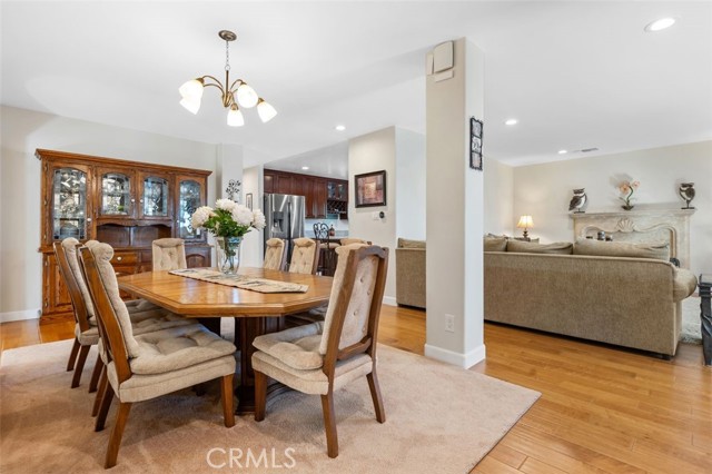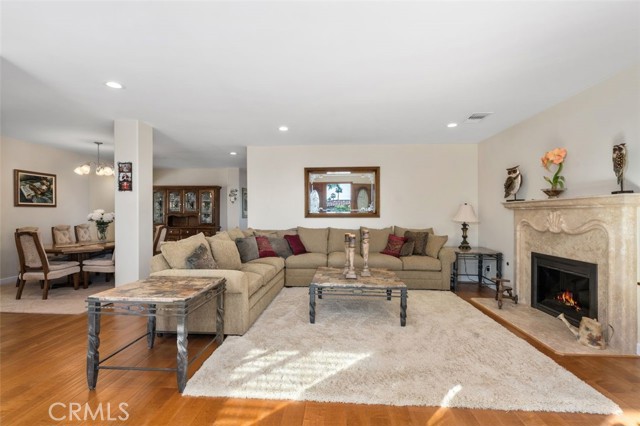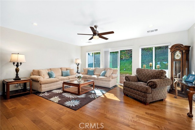 Welcome to this beautifully designed single-story view home, ideally situated on a private corner lot with sweeping city views and an inviting, open floor plan. From the double-door entry framed by elegant pillars to the spacious living areas inside, this home is perfect for both everyday living and entertaining. The home features four bedrooms and three bathrooms, with engineered wood flooring throughout the main living areas and tile in the kitchen and bathrooms. Upon entry, you’re welcomed into a spacious living room highlighted by LED recessed lighting and a cozy fireplace, offering a comfortable gathering space, while the generous family room also includes LED recessed lighting, a ceiling fan, and a sliding glass door that opens to the side yard, creating a seamless indoor-outdoor flow. The spacious kitchen is the heart of the home, offering an expansive bay window that showcases panoramic city views, a large center island, cranberry granite countertops, abundant cabinet space with maple cabinets, stainless steel appliances, and LED recessed lighting. It’s a wonderful space for cooking, entertaining, and hosting family and friends. The thoughtful floor plan provides excellent separation and privacy between the bedroom wings. On one side of the home, you’ll find a half bath combined with the laundry room, a bedroom currently used as an office with mirrored closet doors and a ceiling fan, and a spacious primary suite. The primary suite offers LED recessed lighting, a large walk-in closet, and a sliding door that leads to a private backyard retreat. The primary bathroom features dual sinks, a spa tub, and a separate shower. On the opposite side of the home are two additional bedrooms and a large bathroom, conveniently located for guests or family members and offering added privacy for everyone. Additional features include a two-car garage with plentiful built-in storage cabinets. The exterior is enhanced by fruit trees in both the front and back yards, as well as vinyl fencing around the property for added privacy. The home is located in an established, well-maintained neighborhood with limited traffic, providing a peaceful setting while still offering convenient access to nearby shopping, dining, parks, and major commuter routes. This rare combination of single-story living, a private corner lot, city views, and a functional floor plan makes this property a gem!