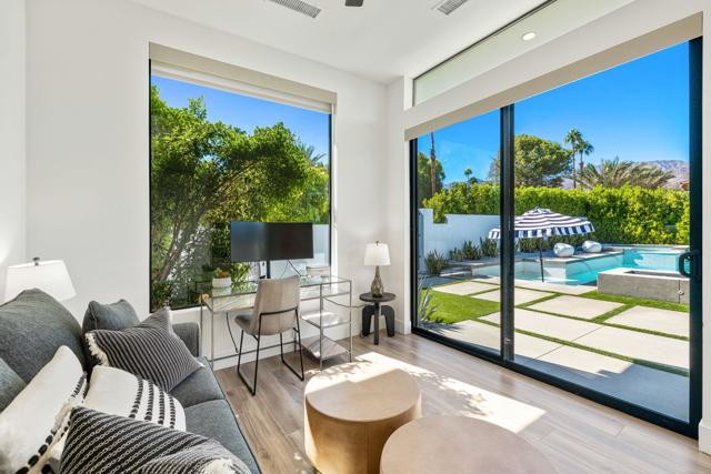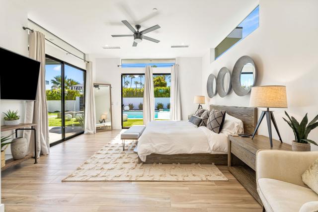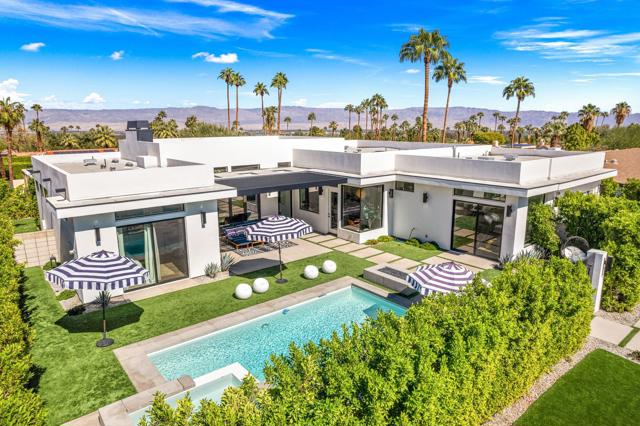 New co-ownership opportunity: Own one-eighth of this turnkey home, professionally managed by Pacaso. The all-white exterior emphasizes the clean, modern design, complemented by faux turf lawns, a pool with aqua tones, and contemporary black-trimmed windows with concrete slab walkways.Privacy walls and a gated entrance enhance comfort around the pool area, which features multiple water elements and a multi-colored light system. A poolside fire pit offers views of the surrounding mountains.Sliding doors from both the front and rear yards open to a spacious interior with an open-concept living and dining area centered around a sleek fireplace wall. White walls and plank tile flooring extend throughout the home, contributing to its modern aesthetic.The kitchen includes soft-close cabinetry, quartz countertops with a waterfall-edge island, a marble tile backsplash, a dining nook, and a coffee station. The space overlooks the pool and back patio, which includes a built-in barbecue island.The primary suite is located in its own wing, with glass doors to the pool area and clerestory windows for natural light. The ensuite features a soaking tub and double rain showers behind a dual splash panel.Two guest rooms share a Jack-and-Jill bath, another bedroom has a private ensuite, and a detached casita provides a fifth bedroom and ensuite. The home comes fully furnished and professionally decorated.