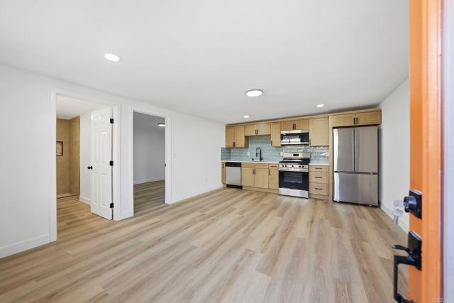 Welcome to this stunning fully remodeled home located in the desirable Serra Mesa neighborhood of San Diego. The main residence offers 3 spacious bedrooms and 2 updated bathrooms, featuring brand-new flooring, fresh interior and exterior paint, recessed lighting, and quality finishes throughout. The upgraded kitchen includes new stainless-steel appliances, shaker cabinets, and quartz countertops, and flows seamlessly into the living room, where bi-fold doors open to a large covered patio—creating a true indoor-outdoor living experience ideal for hosting and relaxing. The expansive backyard is perfect for entertaining, BBQs, or quiet evenings under the stars, with plenty of space for a garden, play area, or future enhancements. Laundry is easily accessible inside the home, and all bedrooms are generously sized for comfort and functionality. A standout feature of this property is the attached ADU with its own private entrance, kitchen, and full bathroom, providing excellent flexibility for multigenerational living, guests, or potential rental income. Enjoy the convenience of living just minutes from Mission Valley, Snapdragon Stadium, SDSU, downtown San Diego, and the beach. With quick access to I-8, I-15, and I-805, commuting is a breeze. You're also close to Costco, Target, Westfield Mission Valley, dining, breweries, parks, and top-rated schools. This move-in-ready home offers the ideal combination of thoughtful design, prime location, and everyday functionality—an excellent opportunity in one of San Diego’s most centrally located neighborhoods.