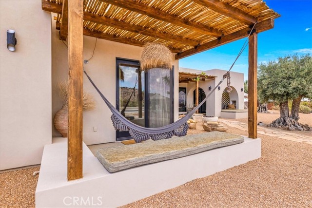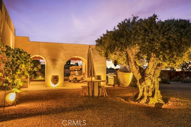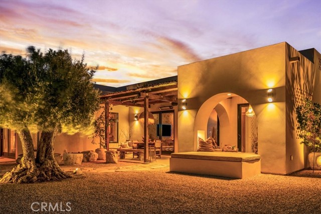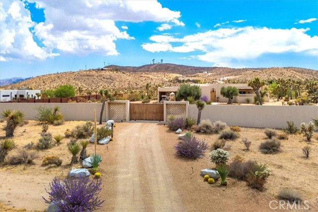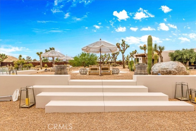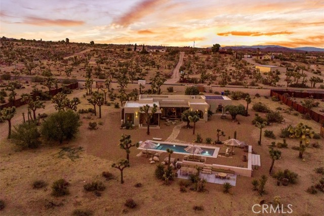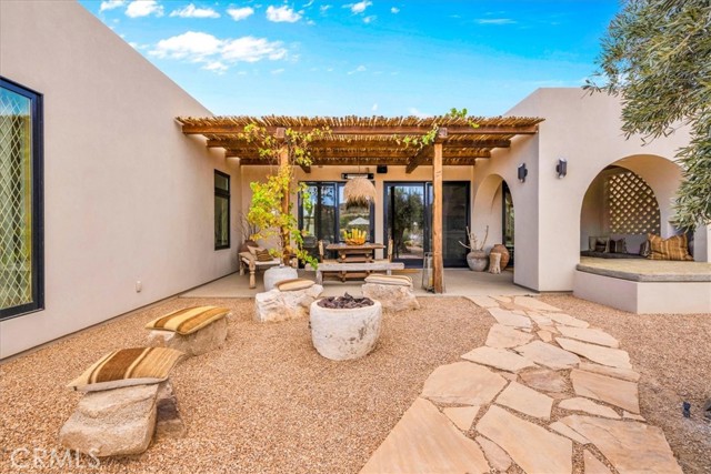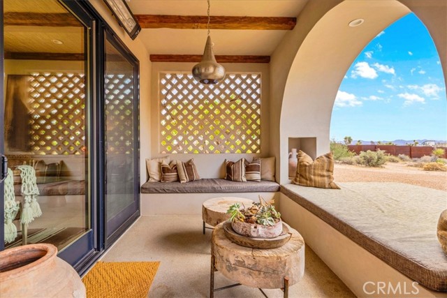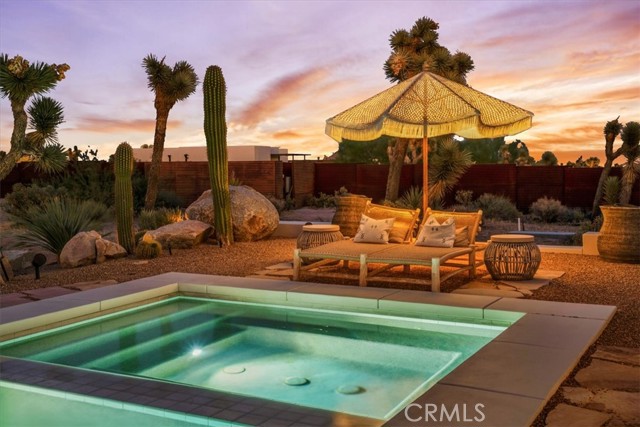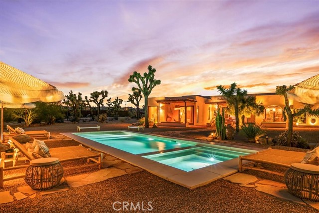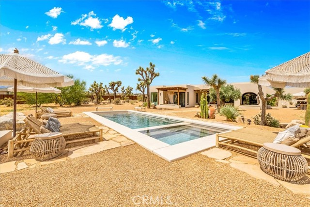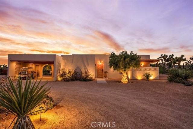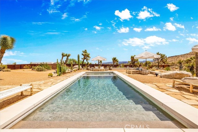 Step into your own private sanctuary in the heart of Yucca Valley—a stunning furnished Moroccan desert-inspired retreat that blends modern luxury with timeless design. This 2-bedroom, 2-bathroom architectural gem spans 1,363 square feet and sits on a serene 2.3-acre lot, offering total privacy and an unmatched desert living experience. From the moment you enter through the electric gate, you’re welcomed into a fully fenced oasis surrounded by native desert landscaping and curated stone walkways. Inside, you'll find sleek concrete floors, custom stone accents, built-ins, and thoughtfully designed living spaces that open seamlessly to the outdoors. The home features private patios, a tranquil inground heated salt water pool and spa, an outdoor fire pit, and shaded lounging areas—perfect for entertaining or unwinding under the stars. New modern architecture is complemented by mini splits for year-round comfort, while a carport adds function and more outdoor opportunities. This is more than just a home—it's a destination. Ideal as a luxury vacation getaway, high-end rental, or full-time desert retreat. Don’t miss the chance to own this truly one-of-a-kind property where style, privacy, and natural beauty meet.