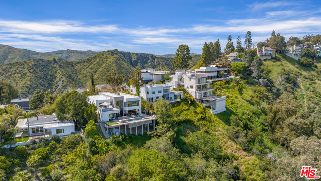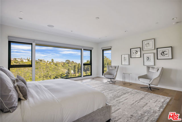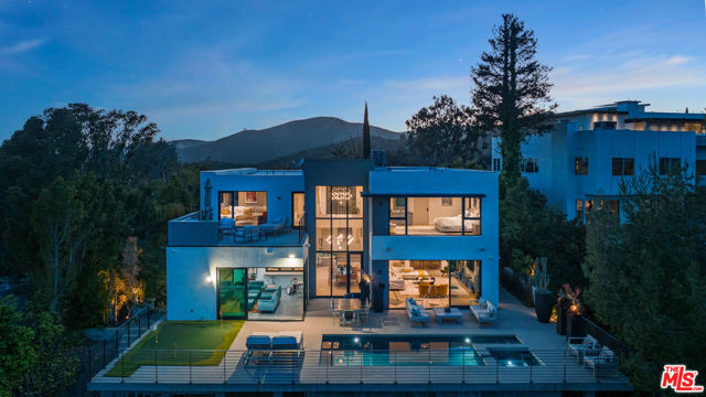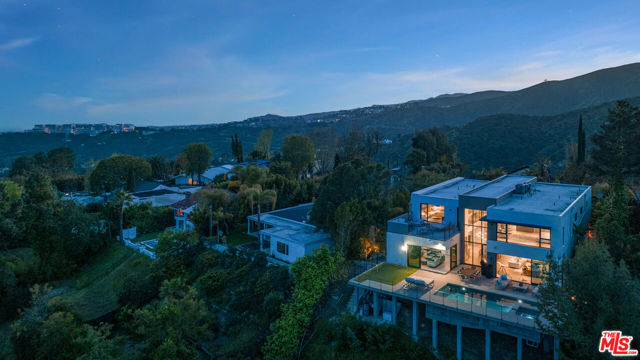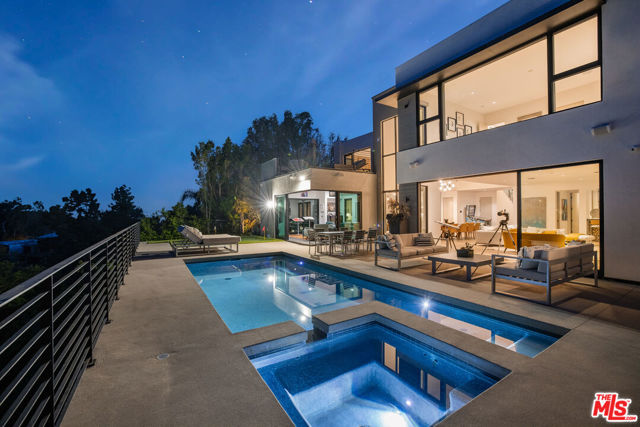 This contemporary estate is brand new and located in Bel Air, offering breathtaking panoramic views from almost every room. As you step into the foyer, which features double-height ceilings and expansive windows, you will fall in love with the property. The open floor plan is ideal for indoor outdoor living, and the luxurious living area boasts a bar and sliding glass doors that open up to the deck. The chef's kitchen includes stainless steel appliances, a breakfast bar island, and an accordion window that opens to an outdoor bar. Enjoy summer evenings with friends and family in the dining room, featuring a two-story window and chandelier. The upper level features a living space with a balcony and en-suite bedrooms, accessible by a railed walkway. The master bedroom offers stunning views over Bel Air, a walk-in closet with built-ins and a center island, a tub, a dual sink vanity, and a glass shower. Relax in the garden surrounded by breathtaking views, seating areas, a dining space, and a pool with a spa. This state-of-the-art smart home is designed to cater to all lifestyles with just a touch of a button.