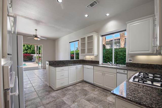 Discover one of the best opportunities in Rancho Mirage! This exceptional home in the coveted Versailles Subdivision has been meticulously maintained by the original owners. As you step through the spacious courtyard and double door entry, you're welcomed into a grand great room featuring soaring ceilings, gas fireplace and a wall of glass that allows the flow of soft natural light and framed views of the mountains and your private pool and spa. Welcome to your perfect entertaining space, where the kitchen and dining area blend seamlessly, offering generous cabinet storage and stylish bar seating. Each of the three bedrooms are strategically positioned to ensure total privacy for everyone. The primary suite features captivating mountain vistas, providing a peaceful backdrop. Indulge in the primary bathroom with double vanity, separate shower, and inviting soaking tub, all designed for your comfort and relaxation. Guest bedroom # one is an en-suite with direct access to the front courtyard with a separate entrance ensuring convenience and privacy for visitors. The backyard is ideal for gatherings with a large, covered patio and plenty of room for seating and outdoor dining. Pool and spa are in perfect condition with lush landscaping all around creating a tranquil vibe. Oversized garage and low HOA dues! Versailles is a gated community with tennis courts and green space. Convenient to shopping and restaurants and just a short drive to Palm Springs or El Paseo.