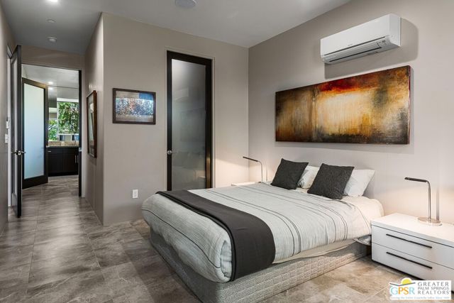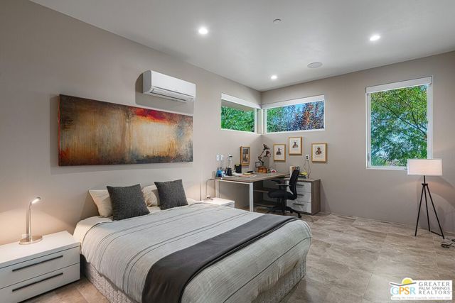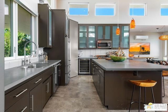 Desert Horizon House is a sophisticated desert retreat set within a private botanical garden of sculptural desert plants designed by a renowned Los Angeles landscape architect. This home is a modern sanctuary where architecture and nature blend perfectly. The stunning location is enhanced by the magical garden that completely envelops the house, complementing its position on the desert floor. Located on an expansive lot, this newer home has breathtaking, unobstructed views of the desert landscape, nearby hills, and distant mountain ranges. Both sunrise and sunset here are unforgettable, bracketing perfect desert days and nights. The property is located moments from Joshua Tree National Park. A custom metal gate opens to a fully fenced estate where meandering pathways, mature trees, and vibrant plantings create a tranquil retreat for nature and bird lovers alike. Inside, the home showcases soaring cathedral ceilings and an airy, minimalist design that emphasizes light, space, and flow. Thoughtfully designed for efficiency, the home features an owned solar energy system that ensures sustainable comfort year-round. Expansive glass sliders on both sides of the main living area invite seamless indoor-outdoor living, allowing the desert breeze to drift through and connect every room to the natural beauty beyond. A testament to refined desert living, Desert Horizon House is the perfect high desert home.