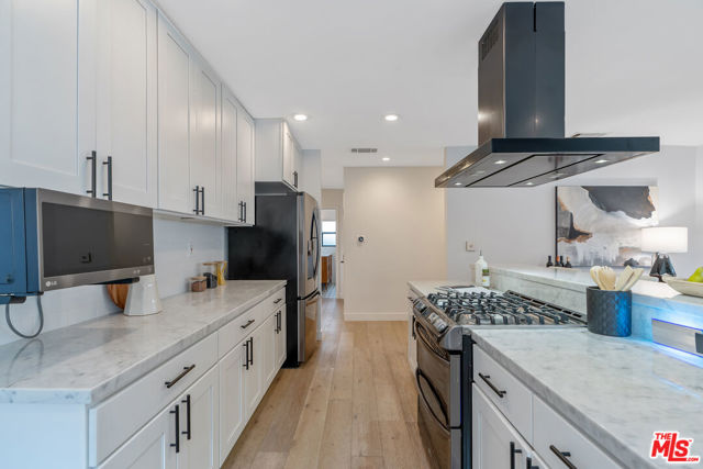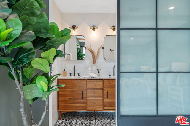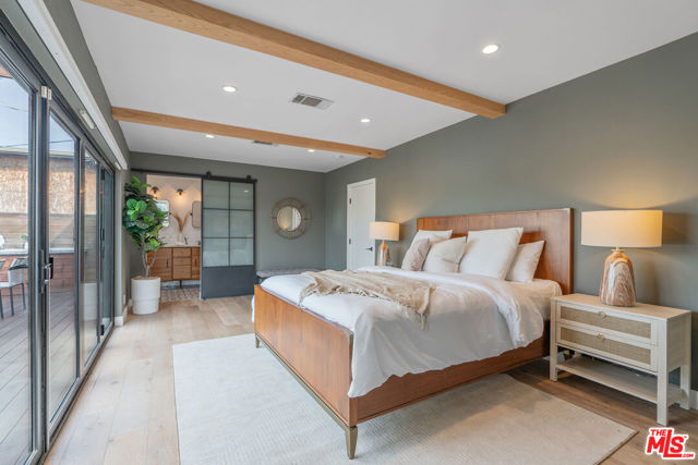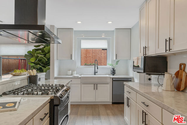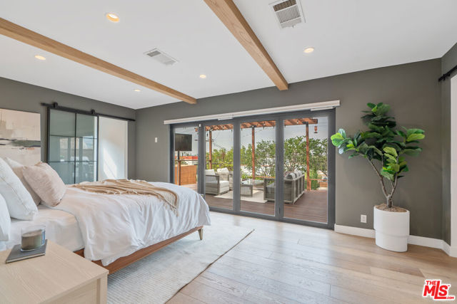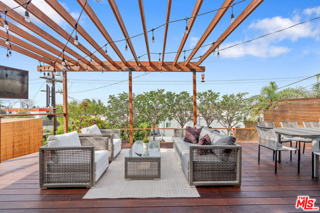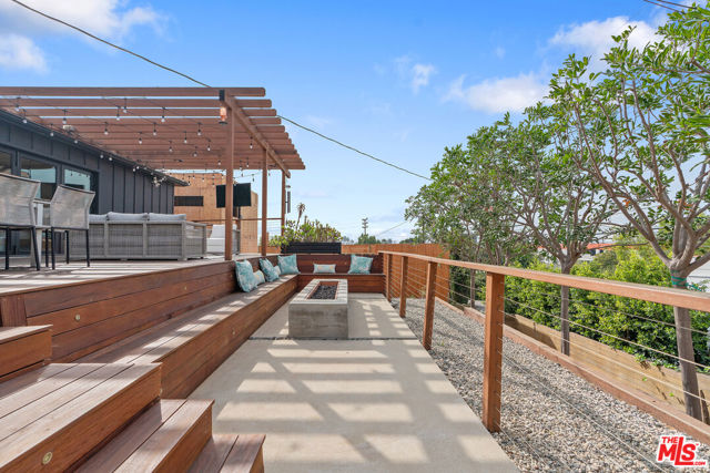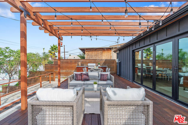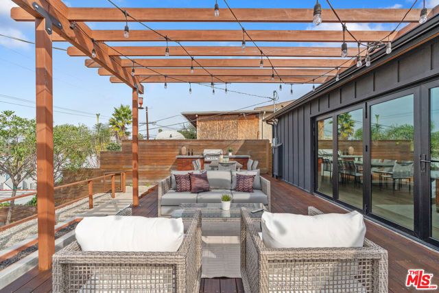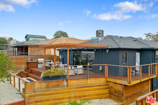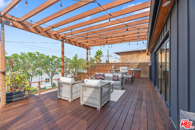 Modern farmhouse in highly desired Picfair Village. The gorgeous Ipe Brazilian Walnut entry deck seamlessly flows into the open-concept floor plan, with the living room, dining room, and kitchen merging into a spacious great room. The huge picture window, controlled by automatic Hunter Douglas window coverings, allows an abundance of natural light to flood the space with a glow. The high-end surface materials, such as the wide plank European Oak floors throughout, the white classic tiles, and Carrara marble countertops, are modern with a timeless flair. The kitchen, equipped with upscale appliances, is a cook's dream. The spacious owner's retreat, featuring a spa bathroom and a walk-in closet, opens seamlessly to the back Ipe deck and terraced yard. This expanded living space features separate areas for lounging and dining, along with a grill, gas fire pit, and outdoor TV, making it perfect for all your alfresco entertaining. The views from the decks are west toward Santa Monica and the gorgeous sunsets, and North to the Hollywood Hills. The systems of the home have been upgraded to include a tankless water heater, a 200-amp electrical panel, a roof, and energy-efficient windows. The attached 2-car garage has built-in storage and epoxy floors. The property is zoned LAR2. Drought-tolerant artificial grass and landscape rock make for a low-maintenance yard. It is time to enjoy this prime location near the Westside, Beverly Hills, Hancock Park, and West Hollywood.