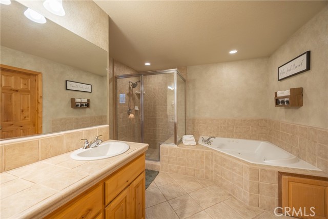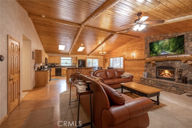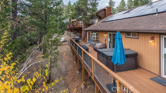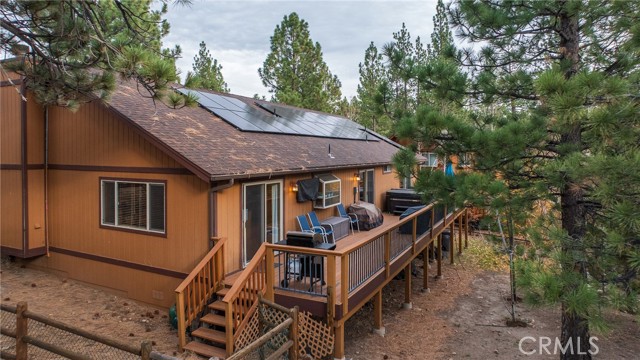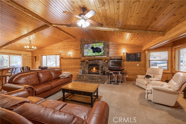 Welcome to Eagle Mountain Estates—where refined mountain living meets everyday comfort. This single-story, log-style home, built in 2003, sits on a generous 10,000+ sq ft lot and offers approx. 2,200 sq ft of thoughtfully designed living space. Soaring vaulted ceilings and warm wood textures create an inviting lodge atmosphere, while large windows bring in beautiful natural light and frame the forested surroundings. The spacious floor plan includes three en suite bedrooms, providing privacy and convenience for family and guests alike. The primary suite offers a peaceful retreat, while the additional bedrooms are perfectly suited for hosting, remote work, or extended stays—each with its own attached bathroom for added comfort. Recent upgrades elevate the home’s efficiency and livability, including a new Aspen spa, new A/C system, new whole-home humidifier, new garage door, and solar panels to help reduce utility costs year-round. Step outside and enjoy Big Bear’s four-season lifestyle from a large refinished back deck that’s perfect for entertaining, outdoor dining, or relaxing under the stars. The charming covered front porch sets the tone for slow mornings with coffee and quiet evenings taking in the mountain air. The attached two-car garage and level access make this home practical in every season. Located in one of Big Bear’s most sought-after neighborhoods, you’re close to the lake, ski slopes, hiking trails, and local conveniences while still feeling tucked away in your own retreat. A standout blend of comfort, character, and quality—this is mountain living done right.