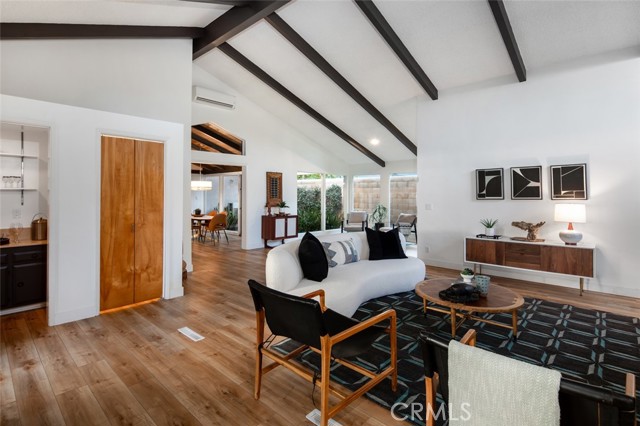 A rare opportunity to own an exceptional, architecturally significant mid-century residence attributed to renowned Long Beach designer Paul Tay, celebrated for his dramatic rooflines, voluminous interiors, organic integration of indoor and outdoor spaces, and meticulous attention to proportion and light. This beautifully updated home captures the spirit of Tay’s most iconic work while offering a refined, modern living experience. A terrazzo-clad entry flows into an expansive living room defined by soaring vaulted ceilings, a sculptural raised-hearth fireplace, and signature floor-to-ceiling glass that frames the lush, private backyard. True to Paul Tay’s residential aesthetic, the home features clean horizontal lines, warm natural materials, and a seamless visual connection between every interior space and the surrounding landscape. The newly remodeled kitchen is a contemporary showpiece, center island, sleek cabinetry, breakfast nook, and effortless flow into an inviting family room with sliders to the covered patio. The adjacent formal dining room is wrapped in natural wood finishes and opens to an intimate side courtyard, a hallmark of Tay’s affinity for protected outdoor vignettes. Two downstairs bedrooms accompany two beautifully remodeled bathrooms, including an oversized downstairs primary, along with a convenient laundry area that can be converted back into a third bedroom if required. Upstairs, the redesigned primary suite feels like a private retreat with vaulted ceilings, an entire wall of closets, a tranquil viewing balcony, and an elegantly redone bathroom featuring a separate soaking tub, walk-in shower, dual closets, and spacious built-in vanities. The home’s wraparound yard is both dramatic and serene, offering mature landscaping, new custom plantings, and multiple areas for dining, lounging, and entertaining. Additional recent improvements include a newer concrete tile roof, fresh interior and exterior paint, and new flooring throughout the first level with plush new carpet upstairs. An oversized two-car garage and sweeping driveway complete the property. Set on an interior tract in the highly coveted Park Estates, this custom Paul Tay residence blends architectural pedigree with thoughtful modern upgrades, creating a one-of-a-kind home for those who appreciate timeless mid-century design elevated for today’s lifestyle.