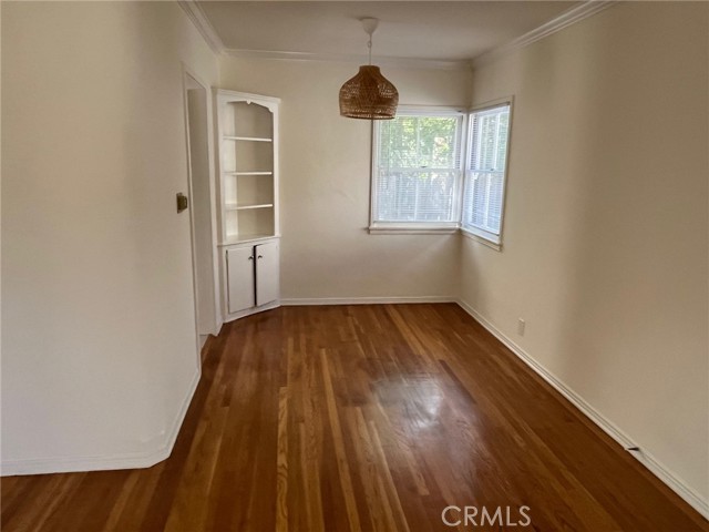 Tucked away in a quiet court of just six cottages, this delightful freestanding one-bedroom, one-bath home offers the perfect blend of privacy, charm, and convenience. With no shared walls. Inside, a bright single-level layout welcomes you with a cozy living room featuring a bay window, gleaming hardwood floors, elegant crown molding, and both wall and window A/C units for year-round comfort. A separate dining area with a built-in corner hutch adds vintage appeal and extra storage, while the galley-style kitchen boasts tiled counters and floors, ample cabinetry, and all essential appliances—including a gas stove, refrigerator, and extractor fan. A built-in vintage ironing board adds a charming touch. The bathroom includes a shower over tub and classic tile flooring. Additional storage is found in both the linen and hall closets, plus a dedicated laundry room with washer, dryer, and extra space. A detached one-car garage provides secure parking, and water and trash services are included. Conveniently located near public transportation and local eateries, this rare cottage combines comfort, character, and location in one inviting package.