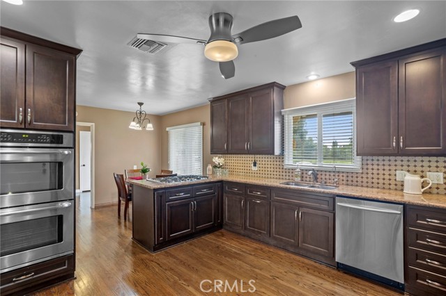 You aren’t drawn to this home simply because it sits across from the prestigious Arrowhead Country Club Golf Course. You’re drawn to it because it feels like calm—a place where mornings arrive slowly, light pours across the fairways, and home finally feels like a breath you’ve been waiting to release. This immaculate single-story home is the perfect blend of classic charm with modern convenience. Inside, stunning ¾" hardwood floors carry you through the main living areas, connecting a welcoming floor plan designed for effortless gatherings. The kitchen is both warm and refined, featuring custom soft-close cabinetry, granite countertops, stainless steel appliances, a stacked double oven, a 36" gas cooktop with downdraft vent, and generous storage. It’s the kind of kitchen where moments happen—holiday meals, morning coffee, late-night conversations. The primary suite is its own retreat, complete with three closets and a private bath offering dual sinks and a jacuzzi tub. Two additional guest bedrooms offer spacious, comfortable accommodations. A large bonus room with its own bathroom creates even more possibility—an ideal haven for multi-generational living, a private guest suite, or a potential ADU conversion (buyer to verify). Every improvement has been purposeful: two hot water heaters, newer HVAC system, upgraded electrical panel, 220-volt outlet in the garage, and a paid-off water softening system—comfort woven seamlessly into everyday living. Dual-pane windows and sliding glass doors allow the light in while keeping the world quiet. Step into the backyard and discover a manicured, peaceful space with a covered patio perfect for warm afternoons and quiet evenings. Multiple fruit trees—apples, guavas, grapes, and navel oranges—bring a bit of orchard charm to your own private haven. This home is more than a list of upgrades. It’s a place to slow down, to gather, to feel grounded. A home built with intention, cared for with devotion, and ready for its next chapter.