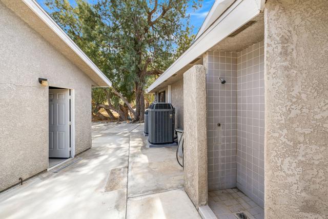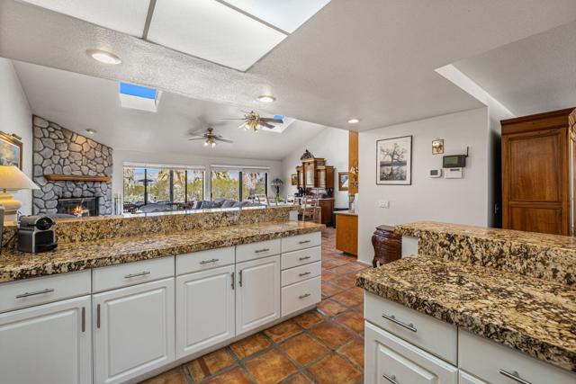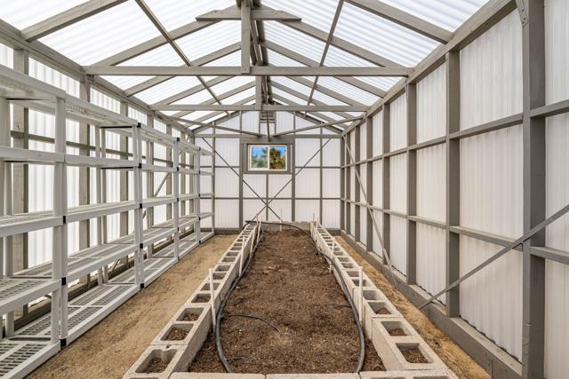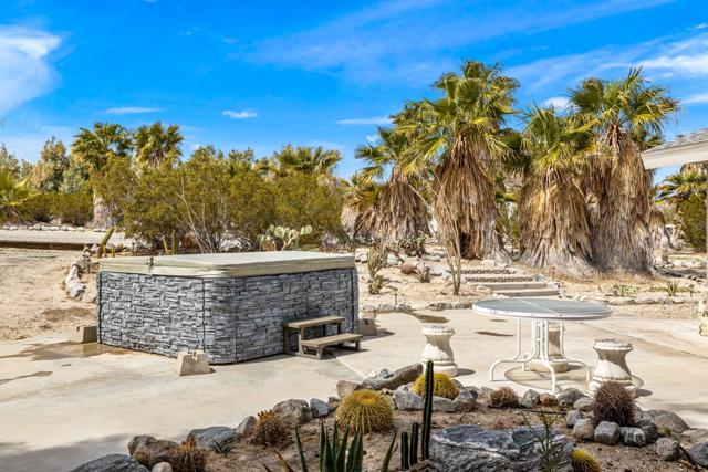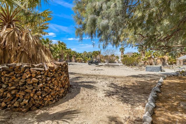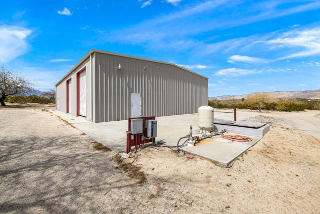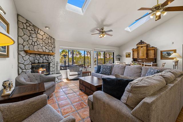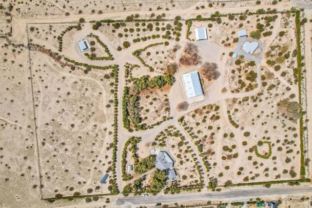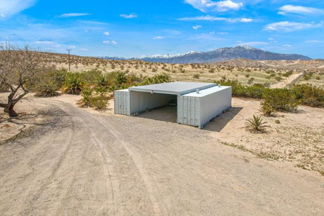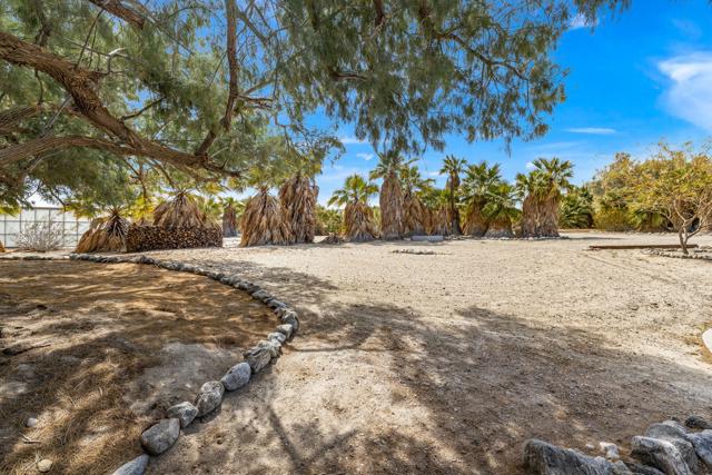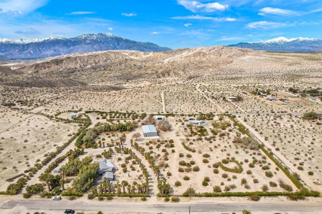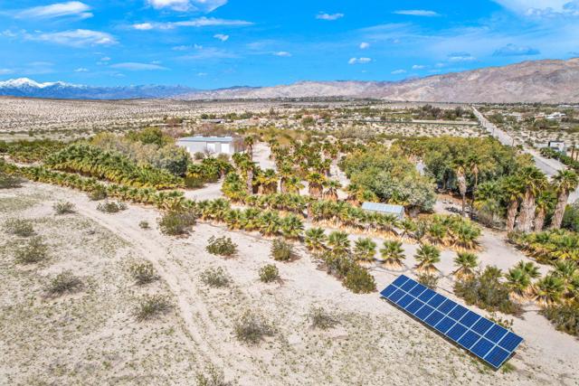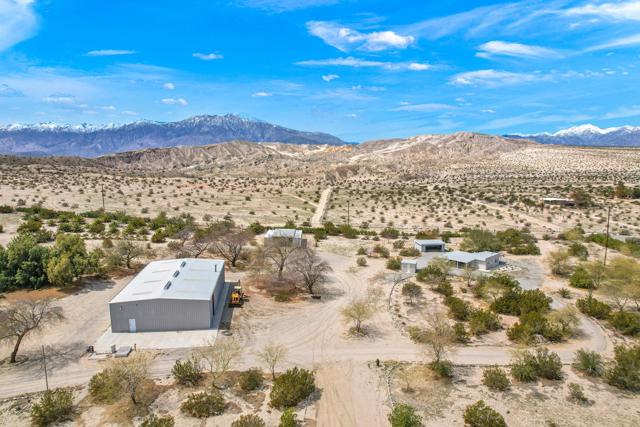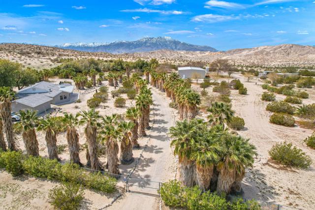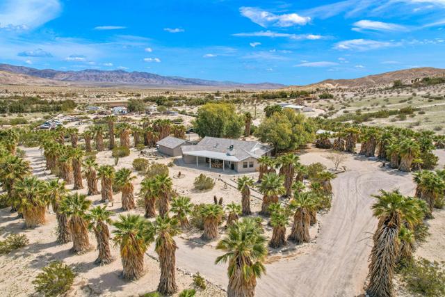 Amazing Sky Valley Ranch property on 15 acres and two legal parcels. Lots of buildings, solar, private well, 300+ palm trees all fenced with five gates, all paved access to the home.Main home is approximately 2400 sqft, with 4 bedroom and 4 baths plus bonus room with sound system and big screen TV or fifth bedroom. The kitchen is a cooks delight with Wolf cooktop, Kitchenaid ovens, slab granite countertops, all appliances in stainless. Large living room/dining room combination, with nice vaulted ceilings, fireplace and sautillo pavers throughout. There is a detached two car garage, 2 tankless hot water system, outdoor shower, as well as owned 7Kw solar system. Newer, top quality roof approximately 5 years old and 2 Trane A/C units. There's a separate approximate 550 sqft. one bedroom house with laundry, 2-car carport+storage shed and sits on a separate 5 acre parcel and address.There is a secure 4000sqft steel building with a bathroom, bedroom plus a full mezzanine and pool table. This building has three rollup doors and full compressor system setup with work benches. The private well is directly outside this building and has been completely overhauled with new tank, variable speed motor and pressure system. On the upper end of the property there is a 300sqft storage building with slab as well as a green house. There are also two storage containers with roof and electrical. The entire property is fenced, gated and has security. Great property in wonderfully maintained condition.