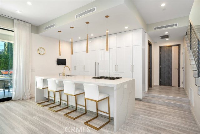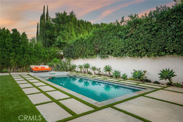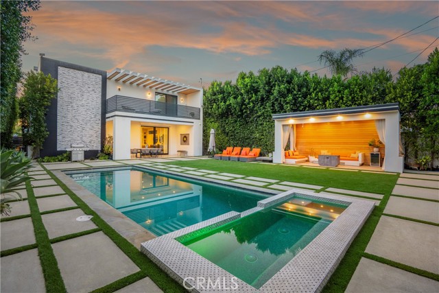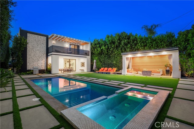 South of the Boulevard and just minutes from Encino Commons, this turnkey custom home blends modern comfort, high design, and everyday security seamlessly. Built in 2019 with designer craftsmanship, it has been meticulously maintained ever since. A gated motor court accommodates up to four cars before reaching the attached garage. 10 foot ceilings open the space up instantly upon entry, where a formal dining room rests alongside the entering corridor leading into the main living area. The sunken family room is bright & airy, and connects to the plush kitchen and also leads into the yard through giant fleetwood doors. Resort style backyard starts with a covered patio with built in speakers, features a cabana, large grass pad, and heated pool with tub. Super private in the backyard and the perfect place to gather, party, relax, or use as a playground for kids. Inside the home are 4 bedrooms, all equipped with en suite bathrooms. One bedroom down, three bedrooms up. Each of the three upstairs bedrooms enjoy a private balcony, with the master’s spanning nearly the entire width of the home overlooking the yard. The master also has a generous walk-in closet with skylights and custom built in organizers/dressers. Laundry room upstairs as well, right outside of a large landing pad in between the rooms, which is also another valuable space for additional furniture, shelves, study area, etc. The garage can be used for cars, a gym, extra room, or an office- it includes A/C and heat and tile floors. Home also features 3 A/C and heating zones, solar, security cameras, and a roll down security shutter. Easy access to Encino's best amenities including top-rated schools, Equinox, Trader Joe's, Encino Commons, Balboa Park, Los Encinos State Historic Park, El Caballero Country Club and the 101 freeway.