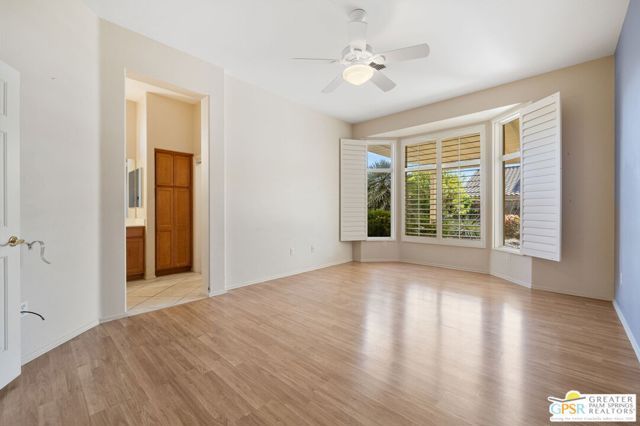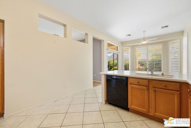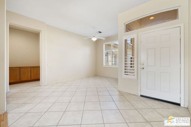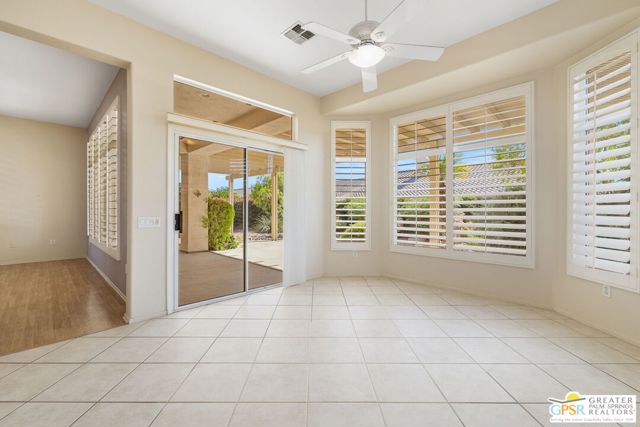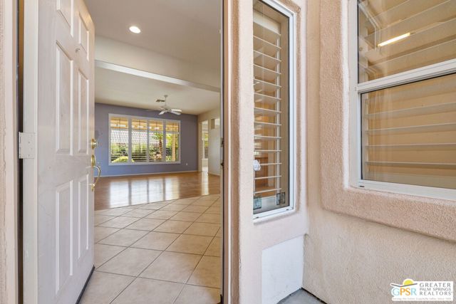 Sun City Palm Desert pied-a-terre delivering sunshine, privacy, and easy desert living! Southern exposure lights up the extended pergola patio and private walled backyard, all wrapped in colorful landscaping. A gated front courtyard creates a welcoming introduction. Inside, tall ceilings and clerestory windows set an airy tone as the living areas open toward the garden and patio. The generous kitchen offers a dining area, counter seating, plenty of storage, and easy access to outdoors. The primary suite features a bay window, walk in closet, and oversized shower with clear glass enclosure. The extended guest bedroom enjoys French doors to the courtyard, and bedroom separation enhances privacy throughout. An oversized two car garage with golf cart space and a convenient side access door completes the home. All of this in Sun City Palm Desert, celebrated for its resort style amenities including two championship golf courses, three clubhouses, multiple pools, fitness centers, tennis and pickleball, dining, clubs, and a vibrant social scene. The popular Tangier layout is here, yet the setting and lifestyle take center stage.