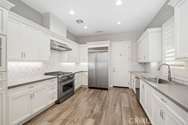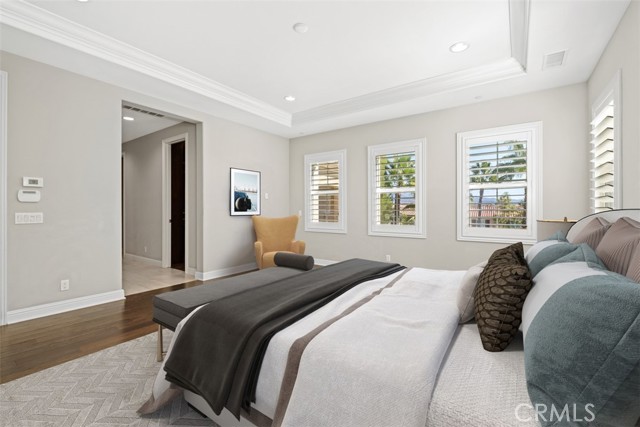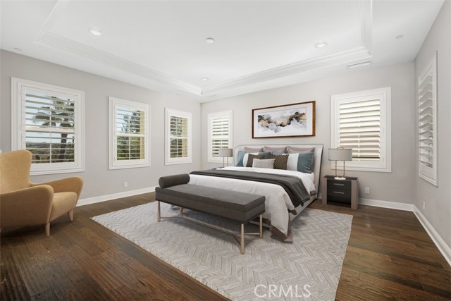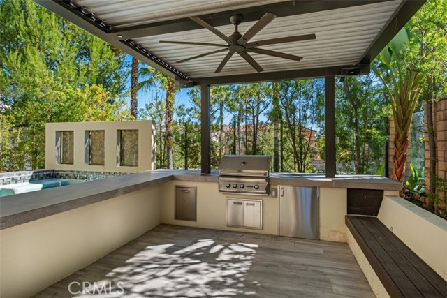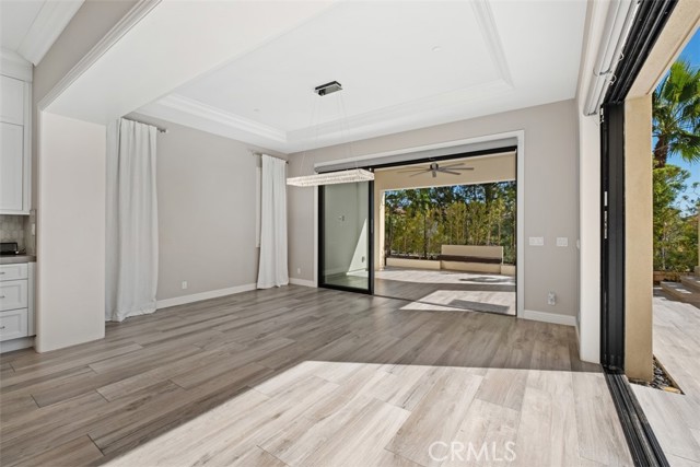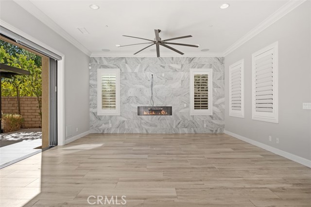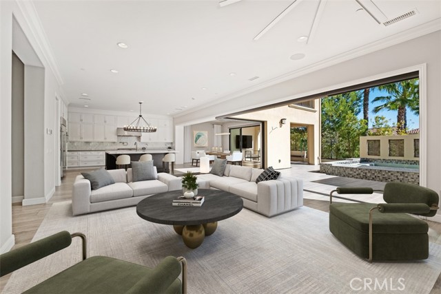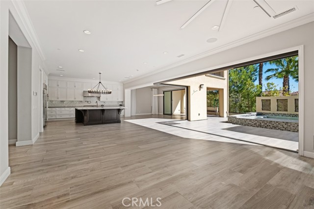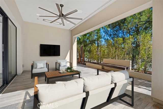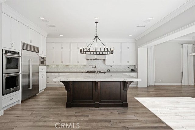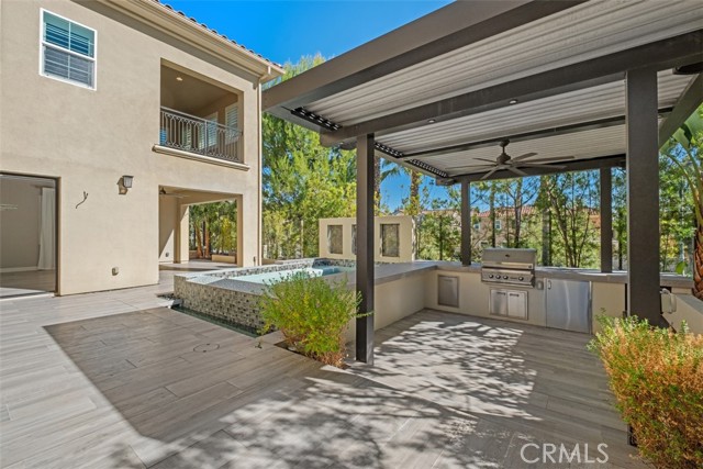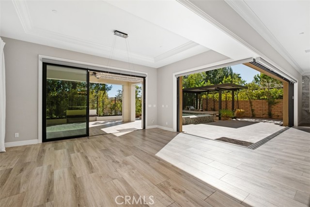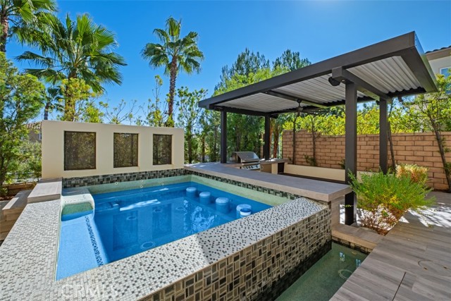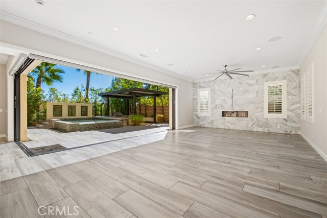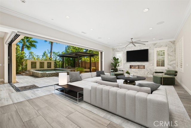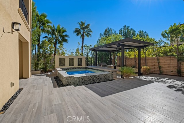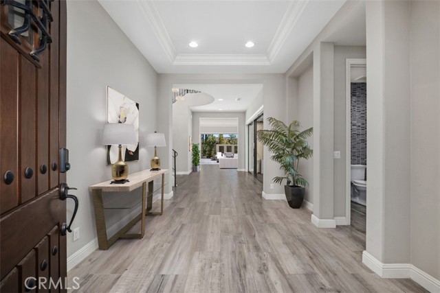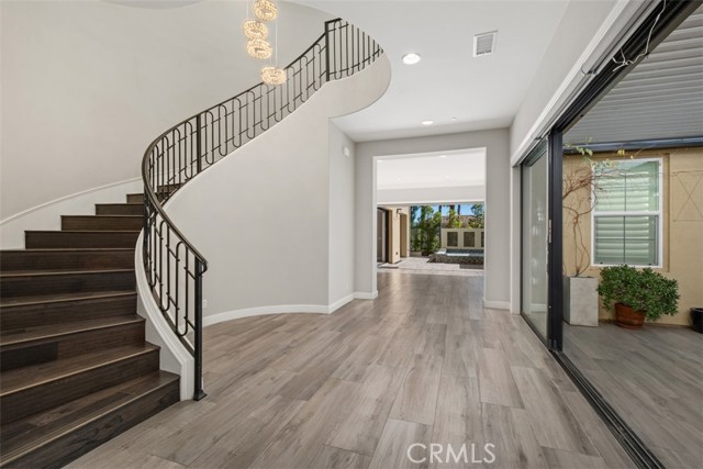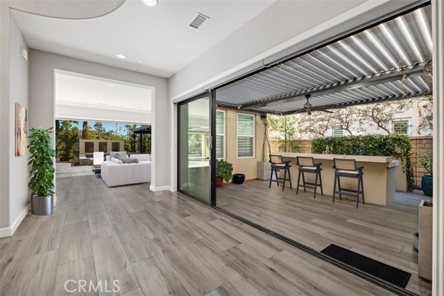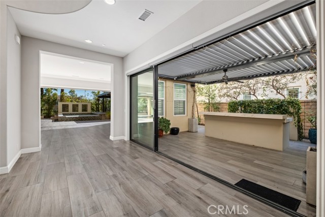 Model-perfect Baker Ranch rental with resort-style pool and spa—rarely available! This stunning 5-bedroom, 5.5-bath home spans a premium 6,283 SF private lot with no rear neighbors, offering ultimate privacy and luxury. Step into a grand foyer with a sweeping custom staircase and dazzling chandelier, all seamlessly controlled by a full smart home system. The expansive living room impresses with a designer accent wall and built-in surround sound. The chef’s dream kitchen features an oversized island beneath a custom chandelier, professional-grade Wolf appliances, Sub-Zero refrigeration, and upgraded cabinetry—plus a separate large prep kitchen with premium stainless steel appliances. Upstairs, a spacious bonus room with built-in cabinetry and a charming Juliet balcony offers versatile living space. The luxurious primary suite is a true retreat, complete with his-and-hers custom walk-in closets, a spa-inspired bath with dual vanities, a deep soaking tub, elegant tile flooring, and full-height stone walls. A private yoga/gym room with its own balcony completes this serene escape. Four additional ensuite bedrooms feature upgraded bathrooms, while premium porcelain travertine flows throughout the downstairs and rich hardwood graces the upper level. Entertain effortlessly with 90-degree stacking doors that open to a breathtaking backyard oasis: a sparkling oversized spa, a dramatic firepit wall, built-in BBQ with sunken seating, a courtyard bar, and an electric pergola for shaded alfresco dining. Owned solar panels help reduce energy costs. Enjoy exclusive Baker Ranch amenities including resort pools, spas, lounge areas, and scenic trails. Conveniently located with easy access to the 133 freeway and premier shopping. This is luxury rental living at its finest!