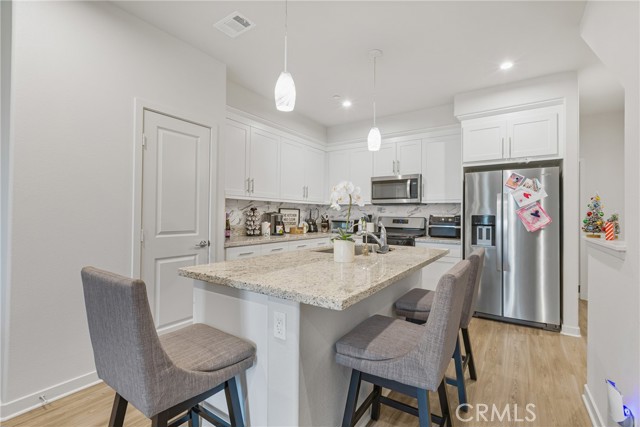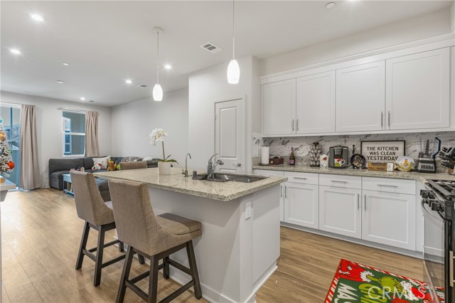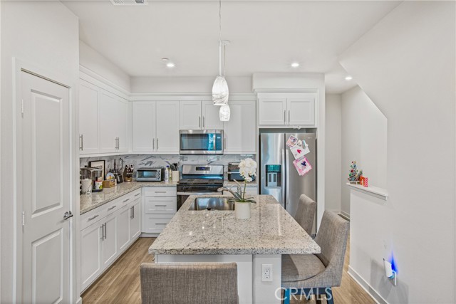 Beautiful newer-built tri-level townhome in the highly sought-after Stafford Place Community of Covina. This spacious 3 bedroom, 3 full bath home offers an open, light-filled floor plan perfect for modern living. The chef-inspired kitchen features a large island, stone countertops, and sleek white cabinetry, opening to the expansive great room and private balcony—ideal for entertaining or relaxing. The main level includes a versatile bedroom and full bath, great for guests, extended family, or a home office. Upstairs, the primary suite offers walk-in closets and an en-suite bath, while the third bedroom also features its own full private bath for added convenience. Additional highlights include a tandem garage with ample storage, beautifully maintained community amenities with a trellis and BBQ area, a low tax rate, and the benefits of newer construction for modern comfort and efficiency. Located close to shopping, dining, and major freeways, this move-in-ready home delivers style, convenience, and exceptional value. A fantastic opportunity in a desirable Covina community!
