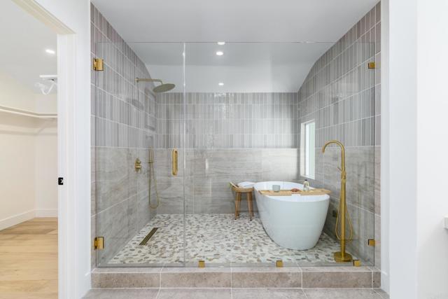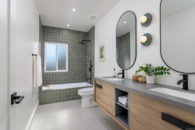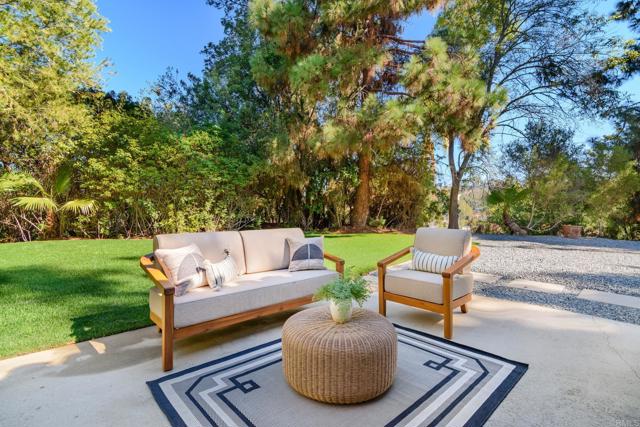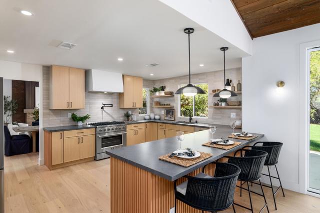 This fully remodeled mid-century modern ranch home combines quality craftsmanship with single-level convenience on a private half-acre in the Poway Unified School District. Vaulted wood-beamed ceilings, large windows, and sliding doors bring natural light and outdoor views throughout the home. Separate living and family rooms provide flexible spaces, each finished with planked ceilings, designer fixtures, and modern fireplaces that emphasize the home’s cohesive design. In the kitchen, slim shaker white oak cabinetry pairs with grey leather quartz countertops, premium appliances, and counter-to-ceiling tile backsplash for a clean, elevated look. A dry bar enhances functionality, while nearby spaces open directly to the backyard for easy indoor-outdoor flow. A dedicated dining area ties the main living areas together with warm, streamlined finishes. The primary suite continues the vaulted wood-beamed ceilings and offers clear views of the backyard. Its spa-style bath features a wet room with a freestanding soaking tub and oversized shower, finished in neutral, refined materials. Dual vanities, designer finishes and a generous walk-in closet complete the suite. Additional bedrooms are set within their own wing, accompanied by a modern hall bath with green tilework and a bold designer powder room. A private office with French doors creates an ideal workspace, and the laundry room adds convenience with designer tile, floating shelves, and a utility sink. Mature trees, multiple patios, and open sections of the half-acre lot offer room for future personalization while maintaining a low-maintenance, peaceful environment. Move-in ready and meticulously updated, this property delivers refined mid-century style, quality materials, and a calm, functional layout—an ideal fit for those seeking comfort, privacy, and access to top-rated Poway schools.