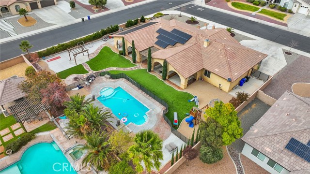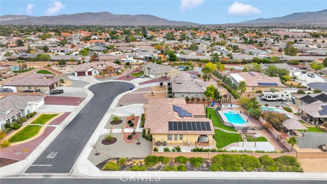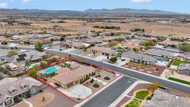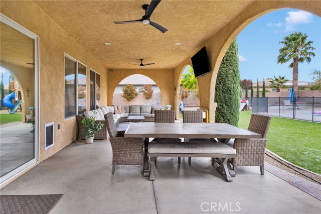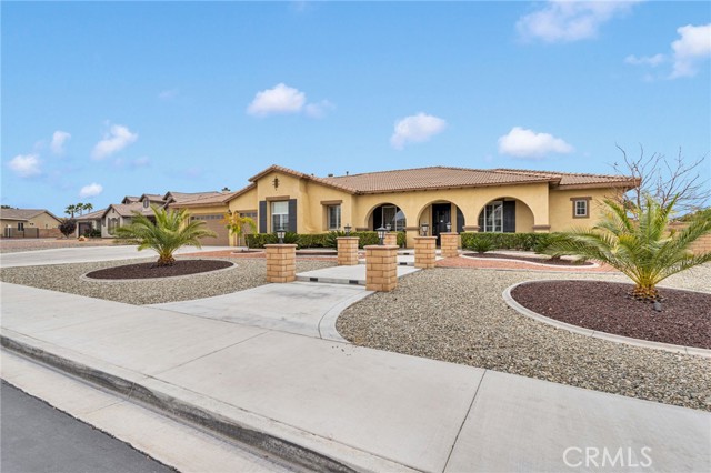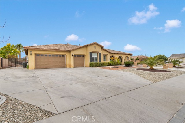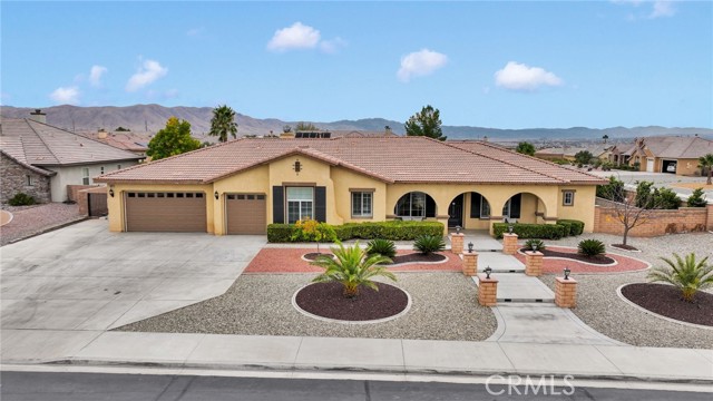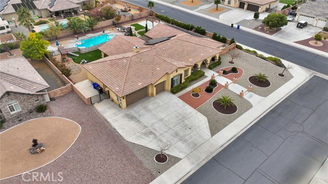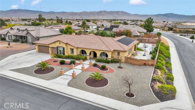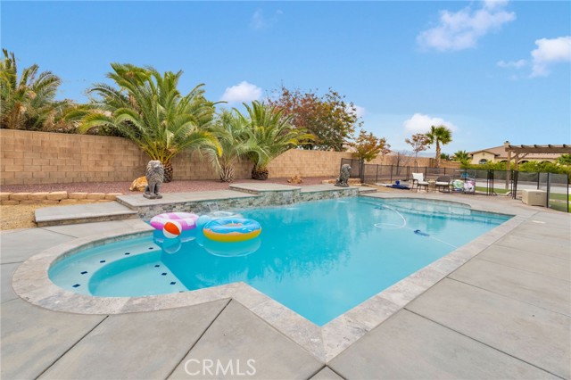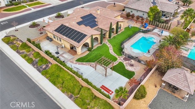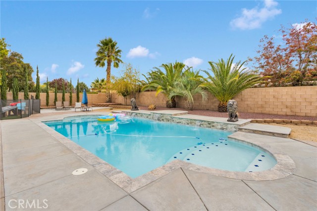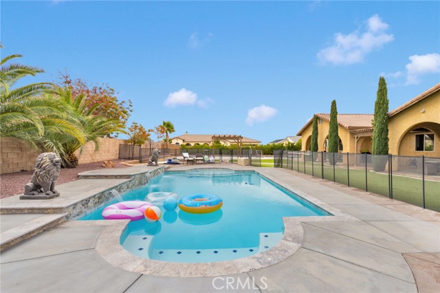 Welcome to Fuji Court, a retreat-like home in the gated Veranda community. With 3,184 sq ft of living space, 4 bedrooms, an office/bonus room, and 2.5 baths this home is designed for refined comfort and easy living. Beautiful curb appeal and landscape lighting highlights the architecture & mature plantings. Inside, tall ceilings and large windows bring natural light into every room. The layout includes a formal living room, formal dining, and a spacious family room with fireplace, built-in wine bar, and expansive views that extend living space into the stunning backyard. The remodeled chef’s kitchen features white cabinetry, quartz countertops, a large island, Carrara marble backsplash, double smart ovens, walk-in pantry, coffee bar, and included refrigerator. The kitchen flows seamlessly to the family room where cooking, conversation and everyday living come together. The owner's suite offers a luxurious place to unwind and a spacious ensuite bath with dual sinks, makeup vanity, jetted soaking tub, and a large walk-in closet with built-in organization. Three additional generously sized bedrooms plus a bonus room that works well as a 5th bedroom, media room or home office. Set on nearly a half-acre corner lot, the backyard is designed for relaxation & recreation. Gated RV parking and extensive concrete work lead to a backyard built for year-round enjoyment. The large under-truss patio offers recessed lighting, ceiling fans and TV mounts. A swimming pool with a sunning ledge, raised waterfalls, tanning deck, & safety fencing creates a private resort feel. A wood gazebo, firepit and included playground equipment add flexible spaces for gathering & outdoor play. Synthetic turf, stonework and concrete finishes are easy care for more time to enjoy the setting. The finished 4-car garage includes epoxy flooring. Practical features include assumable SOLAR, Solar pool heater, 2 HVAC units, indoor laundry and a multi-camera security system. Thoughtfully updated, Fuji Court offers refined comfortable family living in The Verandas, one of Apple Valley’s most sought-after gated neighborhoods that is close to shopping, schools and dining. List Price Includes: Kitchen & garage refrigerator, wine refrigerator, washer, dryer, pool fencing, patio furniture.