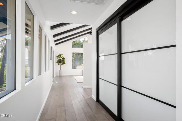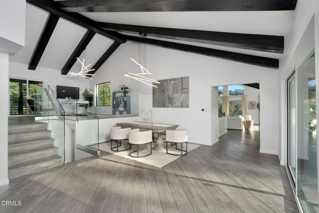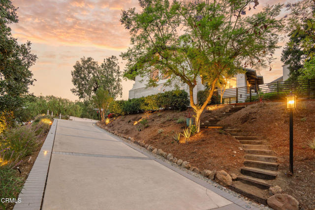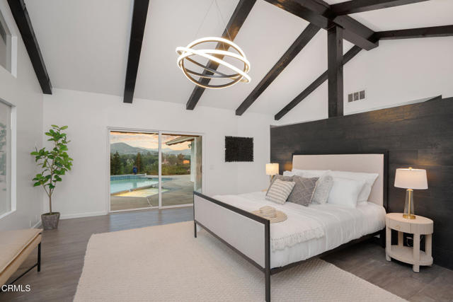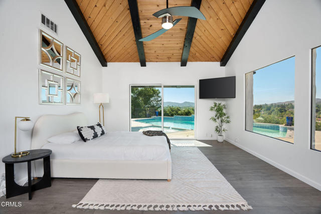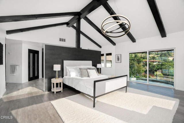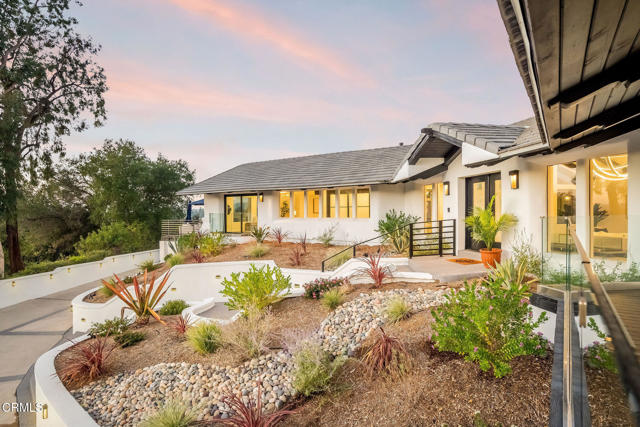 Hollywood Hills meets Westlake Village with this chic and stylish contemporary estate offering breathtaking panoramic views! Set behind a long drive and perched well above street level, this true custom-built home has been refined with contemporary styling and offers extreme privacy within idyllic Westlake Trails. A grand double-door entry opens to large, bright living spaces with wood floors, high-beam ceilings and an abundance of oversized windows flooding the home with tons of natural light and showcasing spectacular views throughout. The step-down living room offers views, a sleek fire feature and an adjacent wet-bar with Carrera marble and counter seating. The gorgeous kitchen is generously equipped with glass-front shaker cabinetry, Carrara marble counters and backsplash, a large center island and high-end appliances including a built-in wine fridge and espresso machine. The open layout flows into the family room with a beautiful floor-to-ceiling tiled fireplace, more oversized windows and veranda access connecting beautiful interior spaces with forever views of the Conejo Valley. This home offers two generously sized bedroom suites; one on the main level and one on the lower level, creating privacy and versatility for usage. In addition, a spacious loft with en-suite bath, walk-in closet and private balcony offers the flexibility to be easily used as a fabulous 4th bedroom suite, dedicated office space or other creative space. The sizable primary suite captures stunning views with walls of windows and a glass door accessing the pool, spa and outdoor lounging spaces. The high beam ceiling, modern chandelier and wooden feature wall add modern character to this sophisticated retreat. The en-suite bathroom is spacious and finished with dark stone, oversized shower, floating dual vanity, separate water closet, walk-in closet and more incredible views. Relax and lounge on the patio, one of the multiple balconies or in the pool/spa and enjoy breathtaking panoramic views of gorgeous sunsets, city lights, surrounding mountains and 4th of July fireworks. Out front, a three-car garage and massive, long driveway provide ample parking or extra play space. A majestic oak tree is a perfect complement to the property, offering shade and a touch of whimsy with swings swaying gently beneath huge, twisting branches. Sweeping panoramic views, exceptional privacy and perfectly situated in one of the most sought-after neighborhoods of Westlake Village.