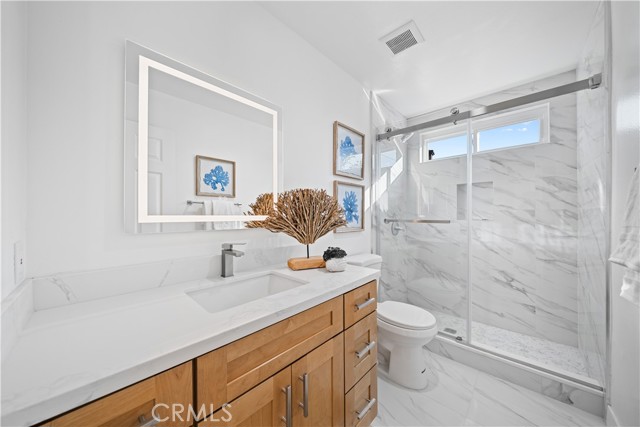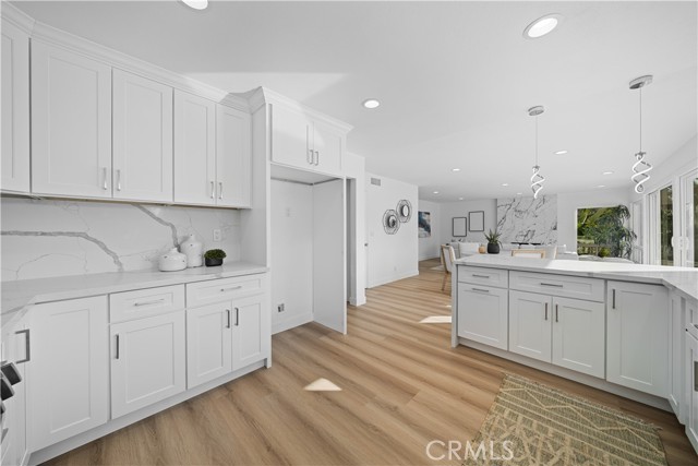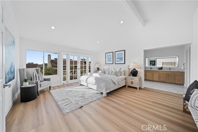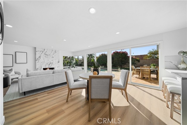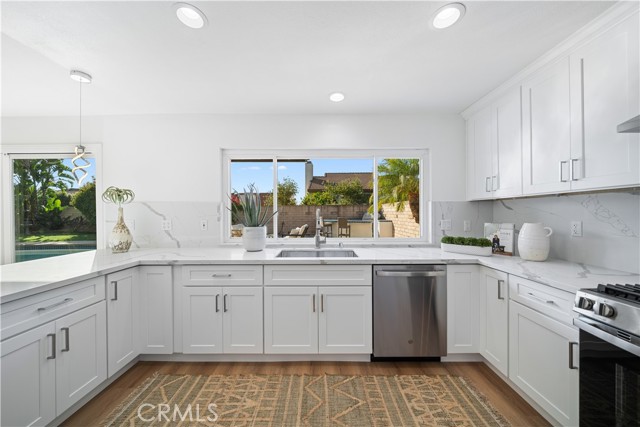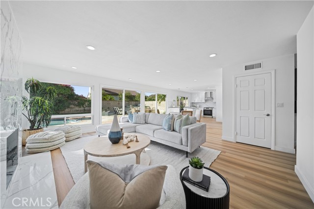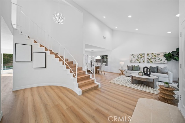 Welcome to this artistically remodeled pool home, ideally located in a mature and tranquil neighborhood of Laguna Hills. With no HOA, low property taxes, and access to the highly acclaimed Saddleback Valley School District, this home delivers the perfect blend of comfort, convenience, and value. Boasting stunning curb appeal, the exterior features flowing water fountains, a welcoming front yard sitting area, tree-lined side yard, a private driveway, and a 3-car garage. Inside, fine craftsmanship shines through every inch of this thoughtfully renovated residence. Step into a bright, open interior with soaring ceilings, newly remodeled stairways, and a seamless blend of modern design and warmth. The living room opens through brand-new French doors to the front porch, offering serene views of lush landscaping and the gentle sounds of the fountain. The formal dining room is highlighted by luxury wood-textured flooring, large sliding windows, and elegant pendant lighting. The gourmet kitchen is a chef’s dream, featuring new stainless-steel appliances, white shaker cabinets with solid wood drawers, marble-style quartz countertops and backsplash, and sleek new hardware. Enjoy effortless indoor-outdoor living as the breakfast area and family room flow directly to the backyard retreat. Perfect for multi-generational living, a guest bedroom with full bathroom is conveniently located on the main level. Upstairs, discover four additional bedrooms and three updated bathrooms, including two en-suites. The primary suite impresses with vaulted ceilings, double-pane French doors, and a private balcony offering sweeping views. The primary bath features dual vanities, a walk-in shower, and a sunlit soaking tub room for the ultimate in relaxation. Additional bathrooms are outfitted with new quartz vanities, modern walk-in showers with barn door closures, and updated lighting and ventilation. Step outside to your own private oasis—a sparkling oversized pool and spa, built-in BBQ island with fridge, generous patio space, and mature trees create the perfect backdrop for entertaining or quiet retreat. The spacious side yard includes raised garden beds, natural turf, and a peaceful reading nook. Just a short walk to community parks, Laguna Hills Plaza, Target, and only one minute from the I-5 freeway, you’ll enjoy unmatched accessibility while still relishing peaceful residential living.