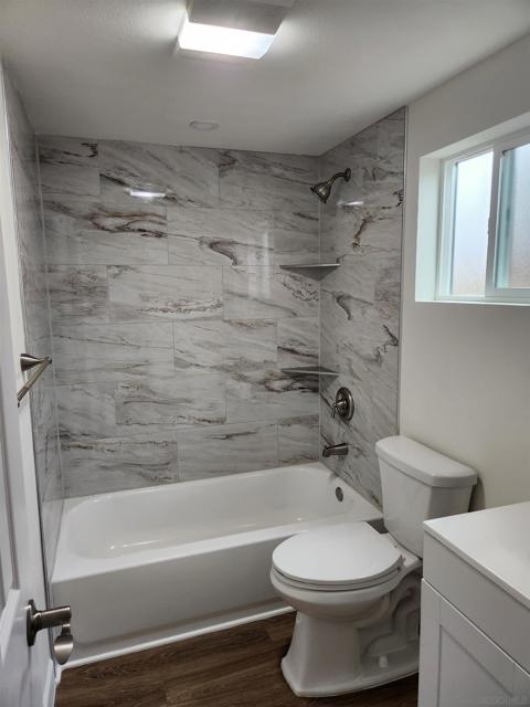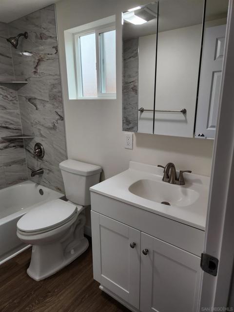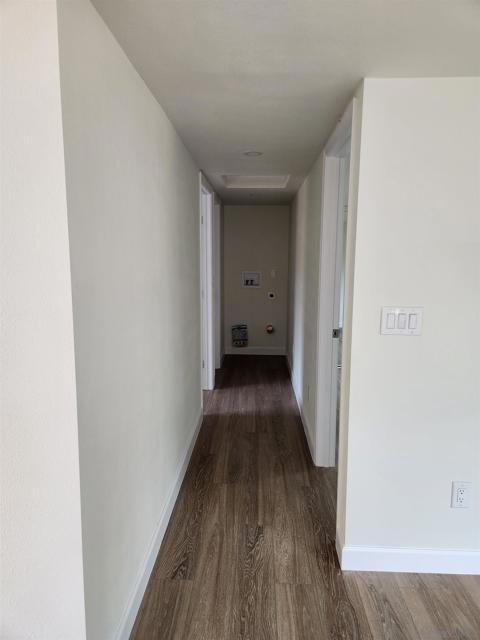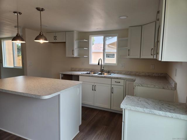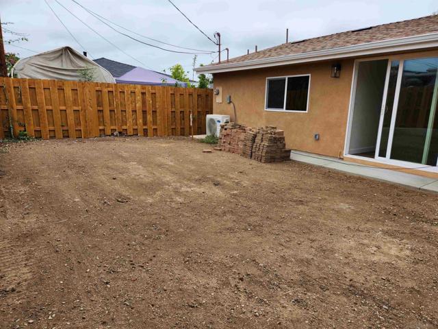 There are 3 units on the lot. This house is the original house, located in the back of the property, behind the front 2-story house and Junior ADU, and is accessible via the paved driveway. The house has been fully renovated: new roof, stucco, windows, doors, new electrical, plumbing, tankless water heater, LED lighting. Open kitchen with formica counter tops and island, refrigerator, dishwasher, gas range/oven. New bathroom. Laminate flooring throughout. Stacked washer/dryer hookups. Master bedroom has a walk-in closet. Gas fireplace in the living room. Large fenced private yard. Off-street parking.