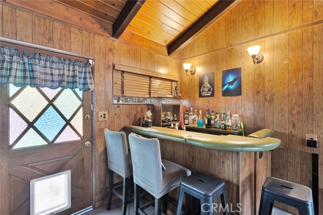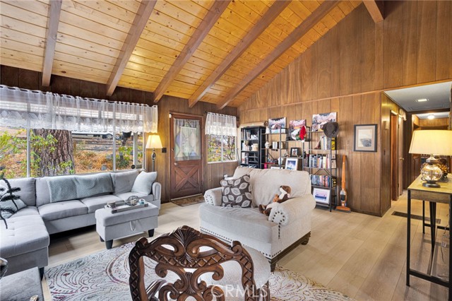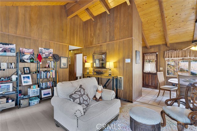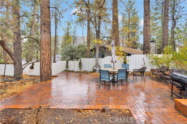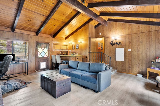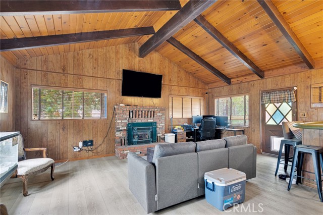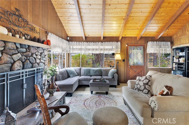Charming Wrightwood Mountain Retreat with Vaulted Cedar Ceilings and Dual Fireplaces! Welcome to this warm and inviting home situated on a spacious 8,805 sq. ft. corner lot in the heart of beautiful Wrightwood, California. This mountain community is known for its fresh air, four seasons, and outdoor recreation—including Mountain High Ski Resort, hiking and biking trails, fishing at nearby Jackson Lake, and charming local shops and restaurants in the Wrightwood Village area. Step inside to a large living room featuring stunning cedar beam vaulted ceilings and a cozy fireplace, creating the perfect mountain ambiance. The cedar ceilings continue into the dining area and kitchen, adding warmth and character throughout. A very spacious family room also features cedar beam vaulted ceilings, a second fireplace, and a built-in bar with a sink and refrigerator—ideal for entertaining or relaxing with friends. From here, a door leads to the backyard, where you’ll find a beautiful brick patio perfect for outdoor gatherings. This home offers central air and heat, newer vinyl waterproof flooring (installed in 2023), and a firewood storage shed with an attached storage closet for convenience. The detached two-car garage includes a laundry room, providing added functionality. Whether you’re looking for a full-time residence or a weekend getaway, this Wrightwood property combines rustic charm, modern comfort, and proximity to all the mountain activities the area is known for.