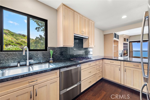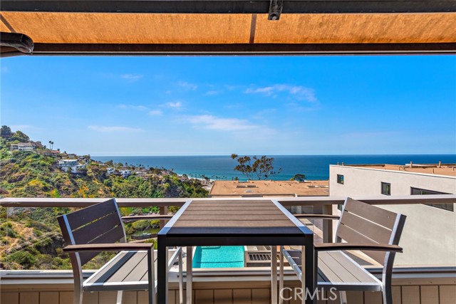 Enjoy panoramic ocean, sunset and coastline views from this uniquely situated back row end unit, bordering nature preserve. Remodeled upgrades throughout include custom etched glass double front door entry, living room with granite surround fireplace, media built-ins with surround sound wiring, and slider to ocean view deck with electric awning. Kitchen boasts granite countertops with bar seating, custom cabinetry, and high-end stainless steel appliances. A formal dining room, den/office with built-in desk, and a powder room complete the upper level. The master suite features a gas fireplace, custom closets, and newly renovated en suite bath. Second bedroom with scenic hillside view also has its own en suite remodeled bathroom. With upgraded dual paned slider & windows throughout, this end unit also enjoys unique side windows for enhanced natural light and an open feel. A finished bonus room on the lower level connects to the direct access two car garage with ample storage space. Located in the exclusive gated community of Laguna Ocean Vista with private pool, clubhouse, and within blocks of Laguna’s renowned beaches, shops & the Montage Resort!