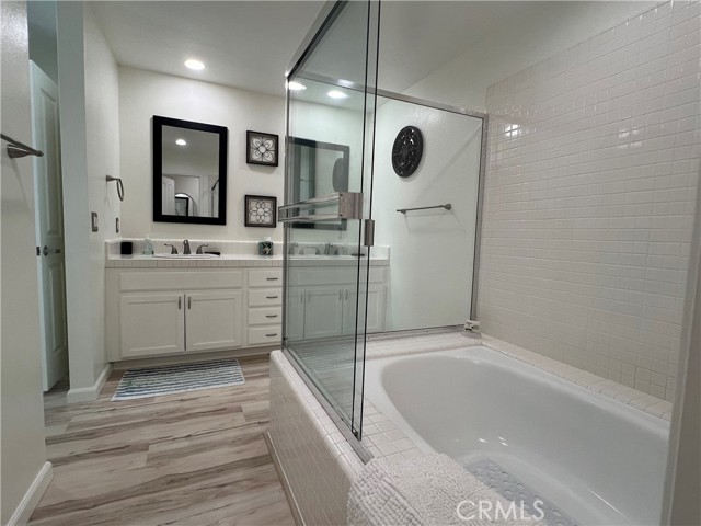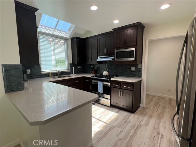 Welcome to your beautifully remodeled oasis in the highly sought-after gated community of Encantamar! This charming single-story home features NO STEPS, making it perfect for all lifestyles. Step inside to discover a modern, open-concept floor plan adorned with luxurious vinyl flooring throughout. The heart of the home is the stunning kitchen, boasting a 5-burner Whirlpool stove, stainless steel appliances, a stylish Mosaic backsplash, and custom lighting that creates an inviting atmosphere. A large skylight window floods the space with natural light, enhancing the overall warmth and ambiance. The spacious living room, complete with a cozy gas fireplace, seamlessly connects to the formal dining area and features sliding doors that open to a generously sized balcony—ideal for entertaining family and friends while enjoying the beautiful city lights view. Retreat to the master bedroom, which offers a large walk-in closet with built-ins, ensuring ample storage space. Additional highlights include an oversized detached two-car garage equipped with built-ins for extra convenience. The gated community feels like a resort, offering amenities such as a sparkling pool, soothing spa, clubhouse, and a fully-equipped exercise room. Conveniently located just a short stroll from shopping, restaurants, and the Cinepolis movie theater, this home truly has it all. Don’t miss your chance to experience the perfect blend of comfort, style, and community living!