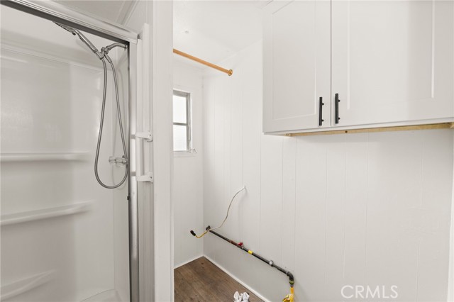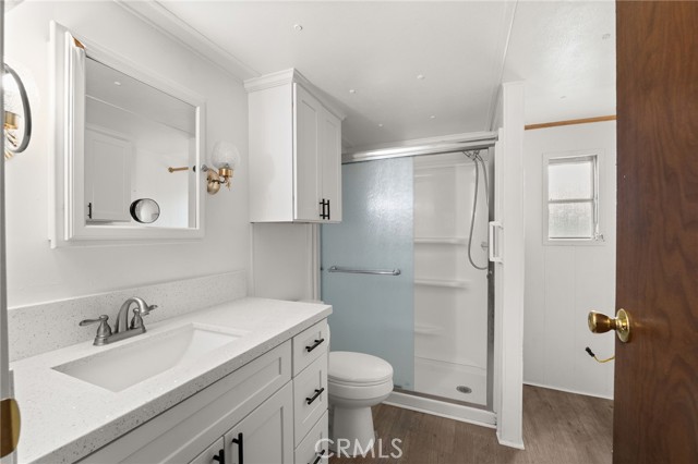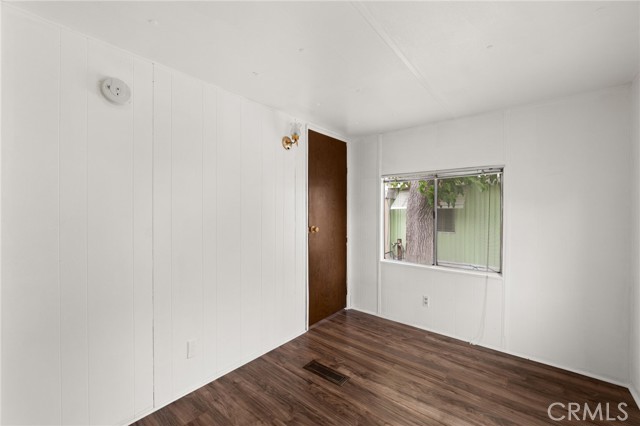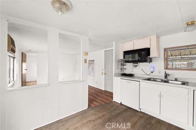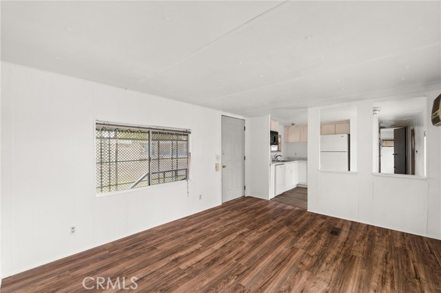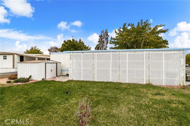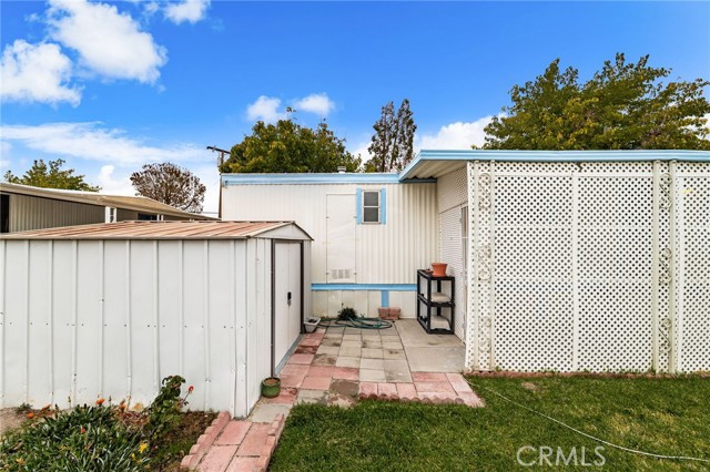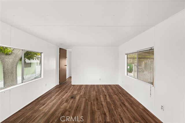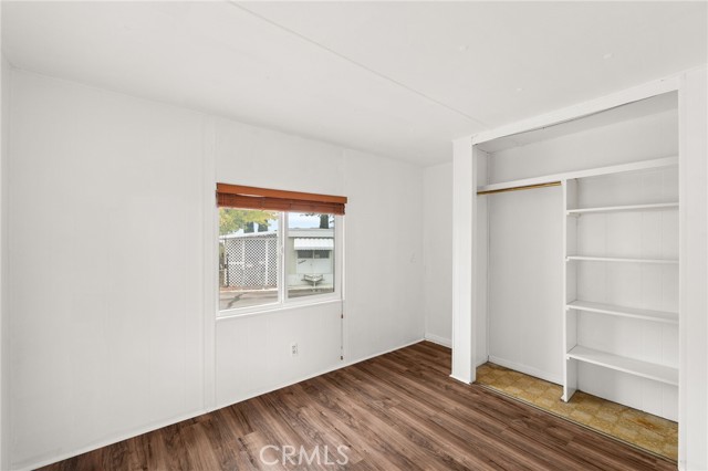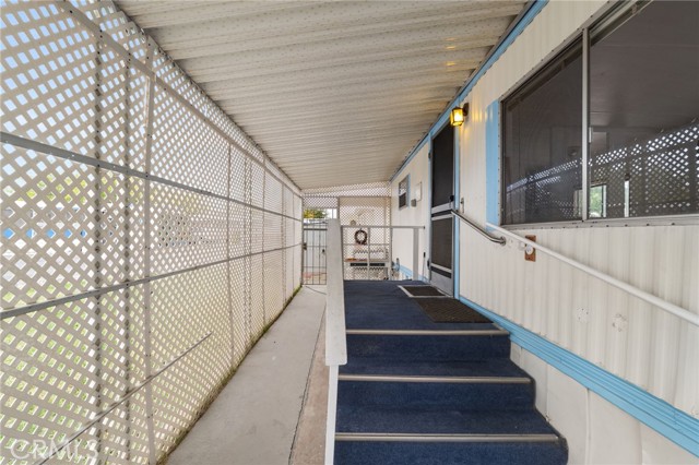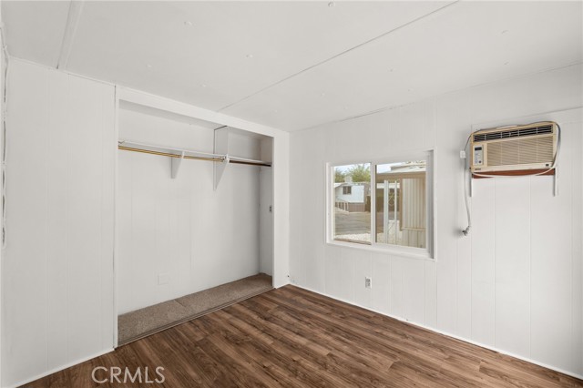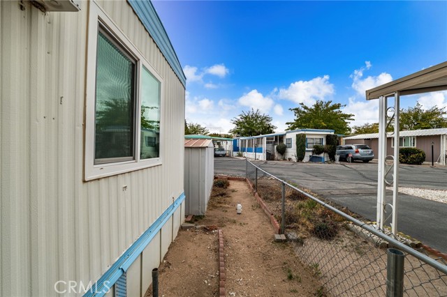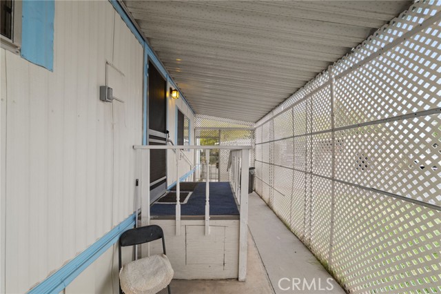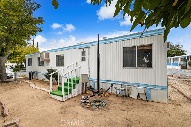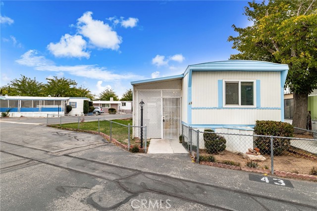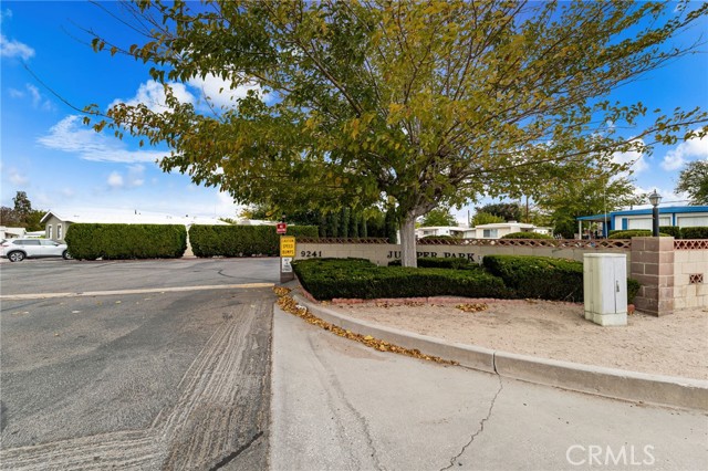 Affordable turnkey home in in the quiet Juniper Senior Park! This two bedroom home is as comfortable as they come, with recently updated kitchen and bathroom. Enter in through a enclosed patio, great for your potted plants and morning coffee lounging. A spacious living room includes a wall mounted swamp cooler which keeps the home nice and cool during those summer months. A pass through takes you to the recently updated kitchen complete with newer sink and dishwasher. Down the hall sits the recently updated bathroom with accessibility features such as a walk in shower and sink with hand holds. Indoor laundry is offered within the bathroom with laundry hookups adjacent to the shower and additional storage above for all your laundry needs. Lots of privacy in each bedroom, as they sit at opposite ends of the home. The primary bedroom enjoys it's own wall mounted AC unit for added nighttime comfort. Windows throughout the home have been recently replaced, home has also been earthquake braced and sewer line has been replaced. This corner lot space enjoys a larger yard space then it's neighboring homes. A large gated lawn space is great for a pet (check with the park for breed restrictions). Excellent location, a walkable distance to Stater Bros Market and local dining and shopping.