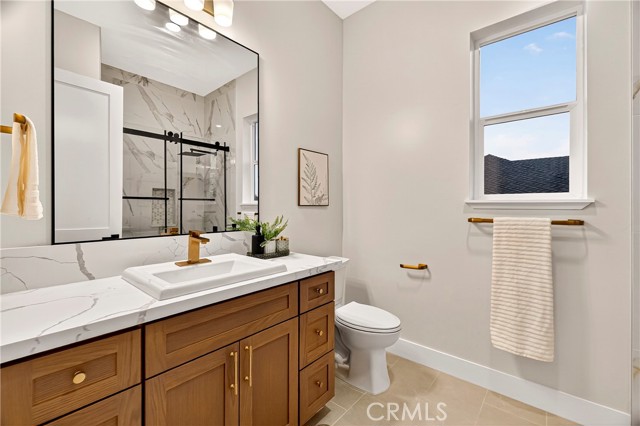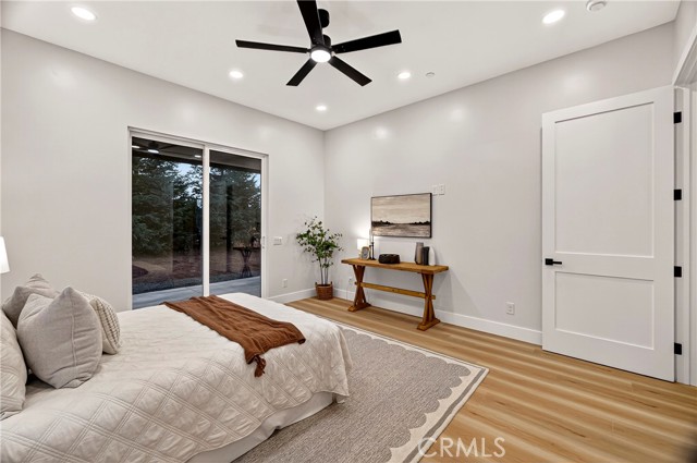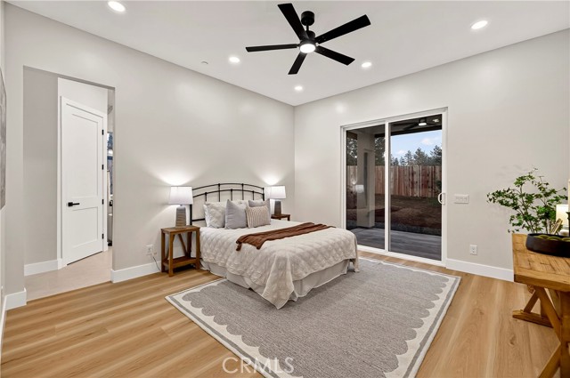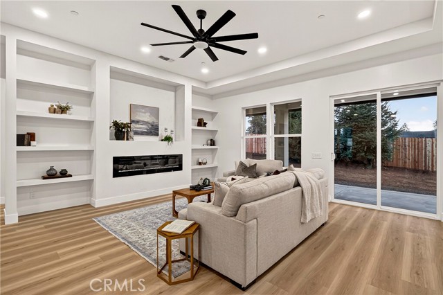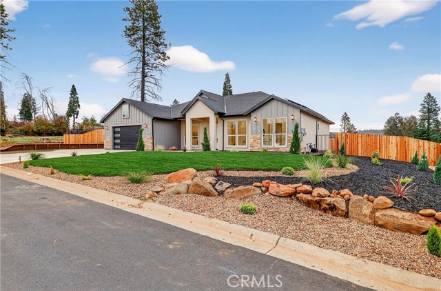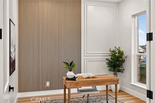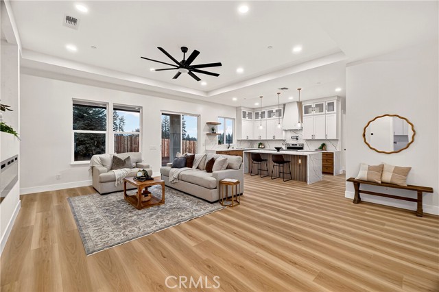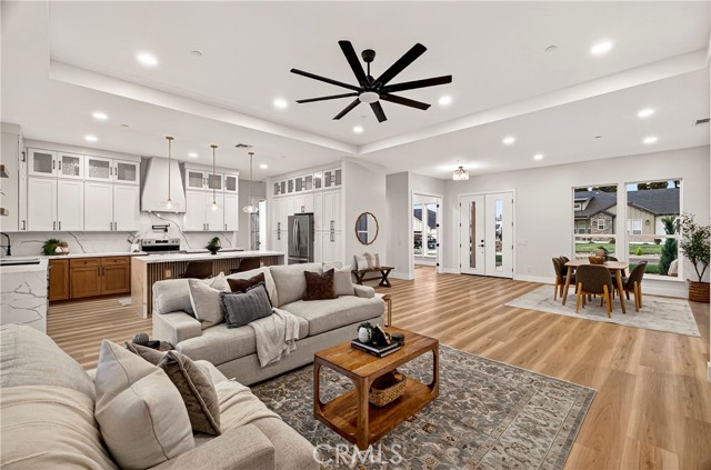 This exceptional brand-new modern farmhouse offers 3 bedrooms + dedicated office/den, 2.5 baths on a private court lot with landscaped grounds and full irrigation. High-end finishes include Calacatta-style quartz counters, two-tone white and rift oak cabinetry, matte black fixtures, and upgraded premium waterproof laminate flooring in a natural European oak finish. Open great room flows into a gourmet kitchen with dramatic waterfall island, paneled stainless appliances, full-slab backsplash, and gold-accented pendant lighting. The dedicated office/den features a custom wood slat accent wall. Primary suite delivers a spa-inspired bath with dual floating vanities, frameless glass shower with rainfall head, sculptural freestanding tub, and spacious walk-in closet with built-in organizers. Additional upgrades: owned solar panels, tankless water heater, dual-zone HVAC, laundry room with sink and storage, and oversized 2-car garage. Gated RV parking. Turnkey luxury in every detail.
