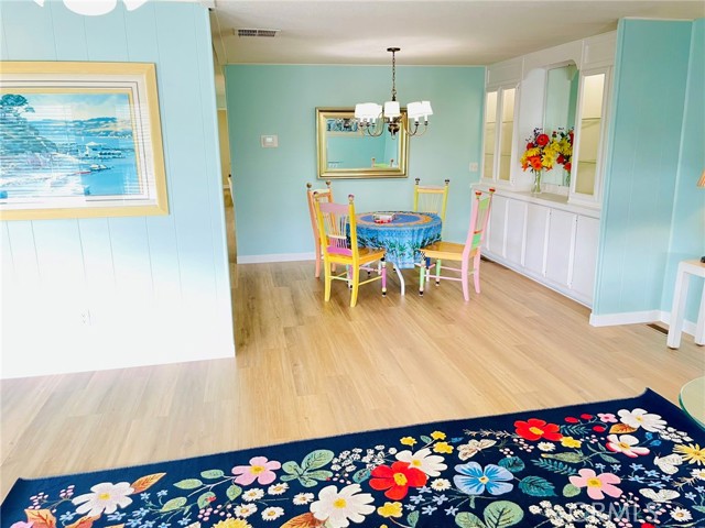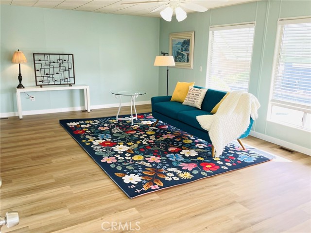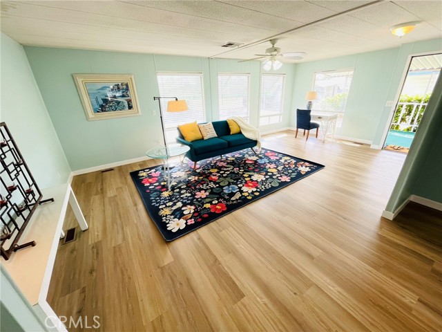 Beautiful! Move-in ready. 2 Bedroom / 2 Bathroom mobilehome located in the wonderful all-age community of New Villa Valencia Mobile Estates in the heart of Orange County. Home offers 1,344. sq. ft of living space, as well as, a large covered porch and patio for outdoor enjoyment. The manicured hedges, fruit trees, almost new exterior paint, and brick steps compliment the home's curb appeal. As you enter the home through the front door, you will immediately notice the large windows for natural lighting and an open floor plan leading to the rest of the home. Kitchen features fairly new white refrigerator, cooktop stove and dishwasher. The breakfast bar is a cozy feature to enjoy that morning cup of coffee or oatmeal with family or friends. Bedrooms have ample living space and mirrored closets. Enjoy the dual vanity in the master bathroom, tub/shower, and separate toilet room. Guest bath has single vanity and walk-in shower. Brand new luxury vinyl plank flooring has been installed throughout the entire house. There is more: ceiling fans, window blinds, two car covered carport parking, and two storage cabinets.
