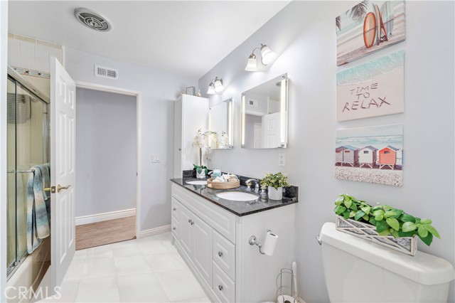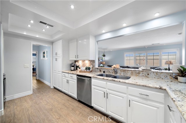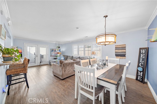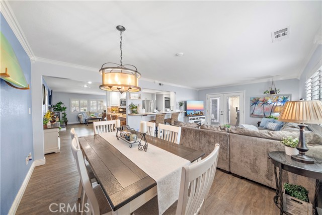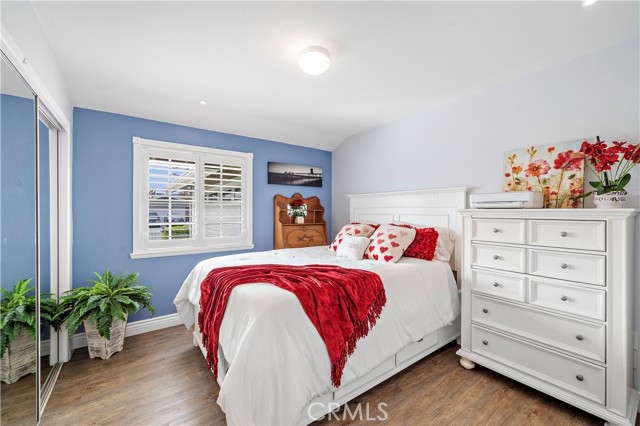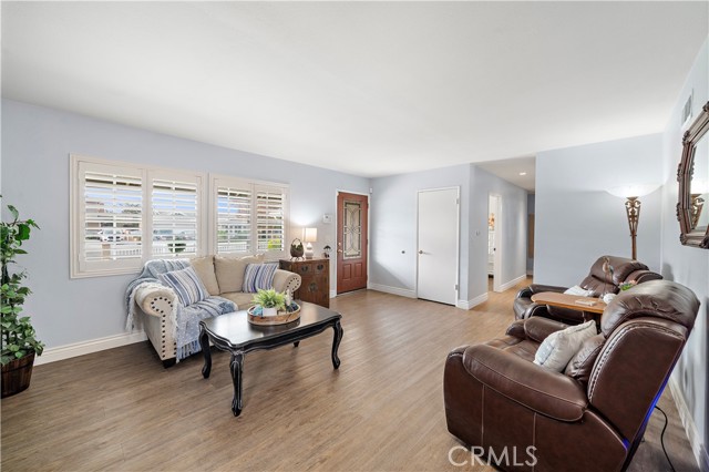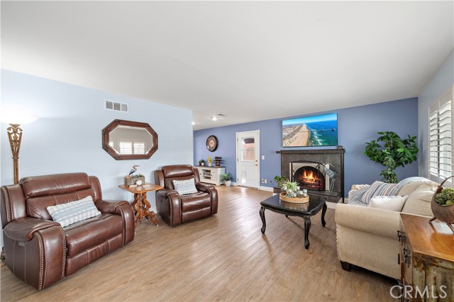 Absolutely stunning and extraordinarily rare, this expanded Dutch Haven Marina single-story home offers an impressive 2,114 square feet of beautifully upgraded, open-flowing living space that radiates warmth, sophistication, and modern comfort at every turn. From the moment you arrive, the charming curb appeal captures your attention with its lush green lawn, flowering gardens, new white vinyl fencing, wide sweeping driveway, and welcoming brick porch with patio cover, and upon entering through the custom beveled-glass front door you are greeted by an elegant formal living room showcasing a slate fireplace and a host of remarkable upgrades including central A/C with Nest programmable thermostat, paid solar, tankless water heater, newer luxury wood-vinyl flooring, dual pane windows, plantation shutters, recessed lighting, ceiling fans, crown molding, tall baseboards, raised-panel interior doors, designer paint, custom window and door casements, and French doors with built-in mini blinds. The expansive additions to this home created an impressive family room with formal dining space and transformed the primary suite into a true retreat complete with a sitting area, French doors to the backyard, a custom-organized walk-in closet, and a spa-inspired bathroom featuring an oversized soaking tub, separate multi-head shower with bench, beautiful carved-wood dual-sink vanity with matching mirrors, glass-block accents, and private water closet. The completely remodeled chef’s kitchen is a showpiece with granite countertops, custom white shaker cabinetry with pullouts, coffered ceilings with extensive recessed lighting, stainless steel appliances including a 5-burner double-oven gas range, microwave, and dishwasher, deep stainless sinks, two breakfast bars, and a convenient inside laundry niche. There are two lovely secondary bedrooms and a guest bath with new tile flooring, dual sinks, and a tiled tub/shower. The low-maintenance backyard offers immaculate hardscape with interlocking pavers, concrete wrap-around patios, and block-wall fencing, while the finished garage impresses with a 220V/30AMP EV outlet, workbench, extensive built-in cabinetry, and new side-mount garage door opener; all of this is located in a highly desirable neighborhood just moments from neighborhood parks, the Bolsa Chica Wetlands, the beach, shopping, dining, and award-winning schools—an exceptionally spacious and beautifully curated home that rarely becomes available.