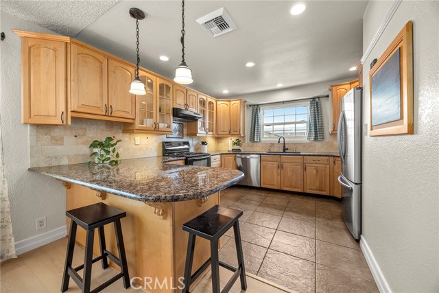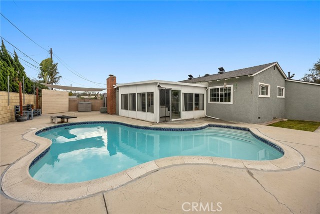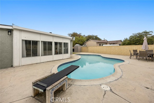 Welcome to this beautifully maintained turnkey 3-bedroom, 1-bathroom home offering 1,223 sqft of living space on a generous 7,247 sqft lot in Westminster. From the moment you arrive, you’ll appreciate the charming curb appeal, manicured front lawn, and expansive driveway—providing ample parking, including RV parking along the side of the home. Step inside to a warm and inviting interior featuring BRAND NEW LVP flooring, a cozy living room with a fireplace, and an upgraded kitchen. The beautiful kitchen offers abundant counter space with granite countertops, travertine backsplash, a breakfast bar with pendant lighting, recessed lighting, tile flooring, and a large window overlooking the front yard. Each bedroom includes a ceiling fan, and the home is equipped with central air conditioning for year-round comfort. Beyond the living room, you’ll find an enclosed patio that serves as a versatile bonus area—perfect for a home office, playroom, or additional lounging space. The remodeled bathroom features custom travertine tile in the shower, adding a touch of luxury. The backyard is an entertainer’s dream, highlighted by a recently converted saltwater pool complete with a diving board. There’s plenty of room for gatherings, outdoor dining, or simply enjoying the California sunshine. Additional storage sheds on both sides of the home provide even more functionality. Situated on the last street of the neighborhood, this location offers the added benefit of no pass-through traffic—creating a peaceful and private setting. With its upgrades, spacious lot, and excellent layout, this home is ready for its next owners to move in and enjoy.