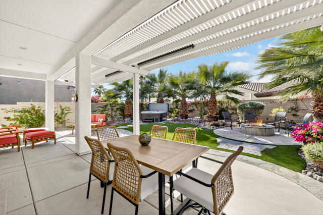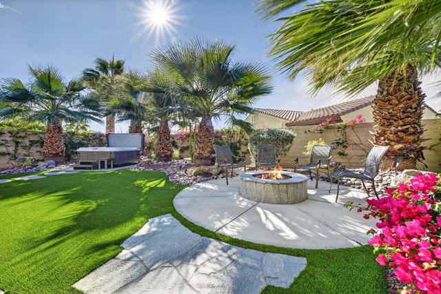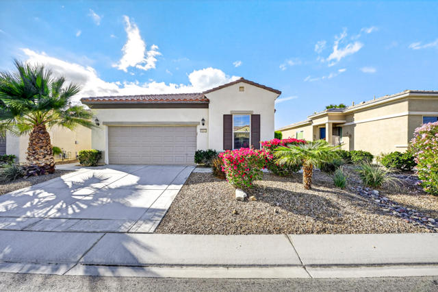 Charming and beautifully maintained Embark floor plan offering 1,321 sq. ft. (EST.) of bright, open living in the highly desirable Phase 3 of Sun City Shadow Hills, a premier 55+ active adult community. This inviting 2-bedroom, 2-bathroom built in 2012 home blends comfort, style, and effortless indoor-outdoor living--perfect as a full-time residence or a serene desert getaway. Inside, you'll find a spacious great room filled with natural light and warm neutral tones, creating a welcoming atmosphere for everyday living and entertaining. The well-appointed kitchen features rich wood cabinetry, granite countertops, a center island with bar seating, and abundant storage--ideal for cooking, hosting, and enjoying time with guests. The primary suite offers a walk-in closet and an en-suite bath with dual sinks and a step-in shower. A comfortable guest bedroom and adjacent full guest bath ensure your visitors feel right at home. Outside, your personal desert sanctuary awaits. The extended covered patio provides generous space for lounging or dining al fresco will pull-down privacy screens, while the beautifully landscaped backyard showcases mature palms, vibrant greenery, artificial turf, and a private spa. A stylish built-in fire pit creates the perfect setting for cozy evenings under the desert sky. Enjoy a south-facing backyard providing beautiful sunshine year-round. Additional highlights include diagonal tile flooring throughout the home, a decorative glass entry door, and an attached 2-car garage. Here at Sun City Shadow Hills, residents enjoy an unmatched lifestyle including resort-style amenities including two clubhouses, two golf courses, pools and spas, fitness centers, tennis and pickleball courts, social clubs, and 24-hour security. Comfort, charm, and resort-style living--your desert oasis awaits!