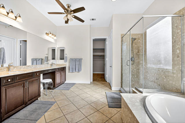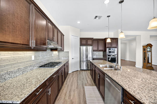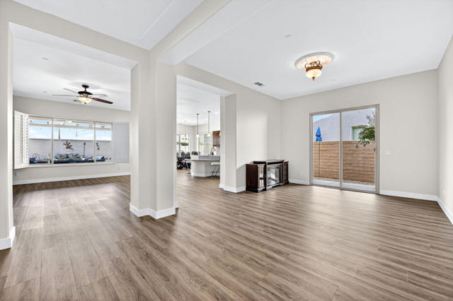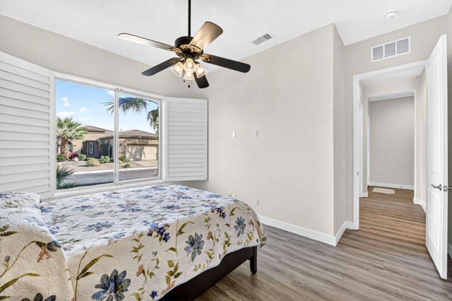 Welcome to resort-style living in this beautifully upgraded Gathering floor plan, located in the desirable Phase 3 of Sun City Shadow Hills. From the moment you arrive, this home impresses with stunning curb appeal, featuring a thoughtfully designed front entry, paver walkways and driveway, modern stone accents, and low-maintenance artificial turf that creates a clean, sophisticated look year-round. Inside, you'll find 2,331 sq. ft. of open, light-filled living space with luxury vinyl plank flooring throughout--a perfect blend of style, durability, and comfort. This well-designed home offers 3 spacious bedrooms and 3 bathrooms. The expansive great room flows seamlessly into the gourmet kitchen, complete with rich cabinetry, granite countertops, stainless steel appliances, double ovens, a large island with seating, and abundant storage--perfect for entertaining or everyday gatherings. Retreat to the luxurious primary suite featuring a spa-inspired bathroom with dual vanities, a soaking tub, walk-in shower, and an oversized walk-in closet. Additional highlights include a beautifully appointed guest bedroom, a separate guest casita-style bedroom with ensuite bath, and ample natural light throughout. Step outside to your private, low-maintenance outdoor retreat featuring an extended covered patio, multiple seating areas, ceiling fans, pavers throughout, a beautiful water feature and a built-in outdoor kitchen--ideal for hosting, relaxing, or enjoying peaceful desert evenings. Located within Sun City Shadow Hills, a premier 55+ community offering two clubhouses, championship golf, fitness centers, pools & spas, pickleball & tennis, social clubs, and endless activities, this home delivers the perfect blend of comfort, style, and active adult living.