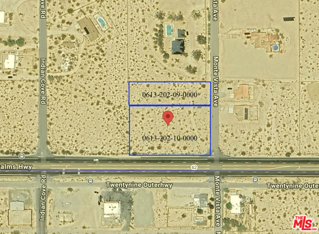 Properties being sold in conjunction with the lot next door, APN: 0613-202-09-0000; buyer to do their own due diligence regarding what can be constructed on both lots. Properties located on a corner of Twentynine Palms Highway and Monte Vista Road.