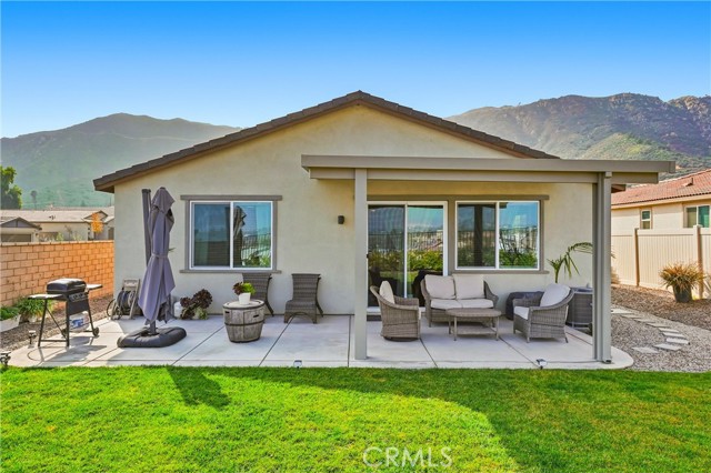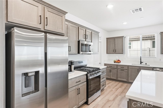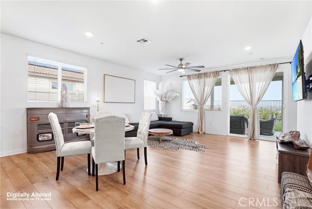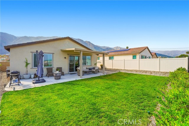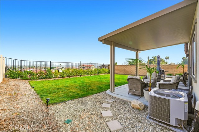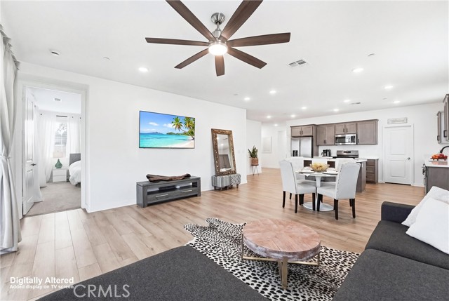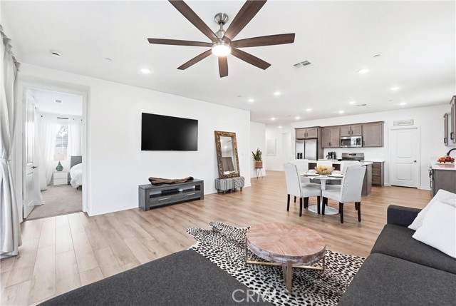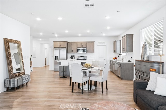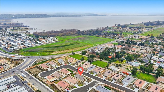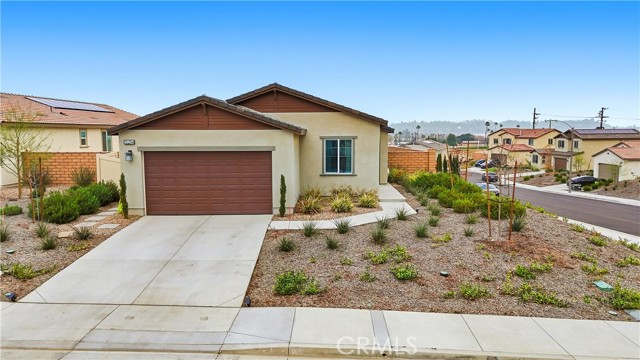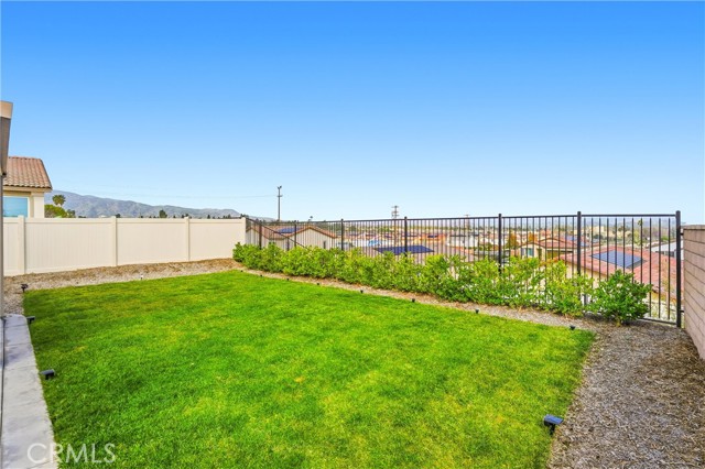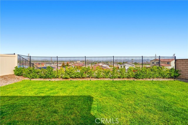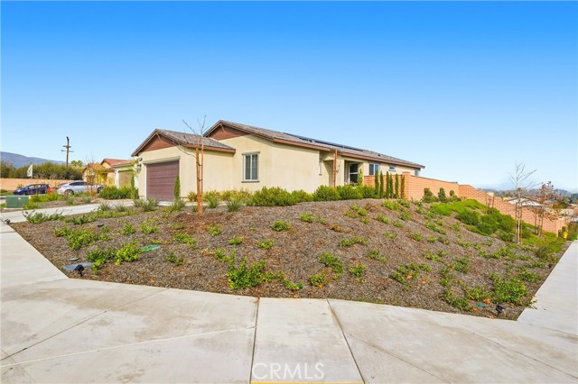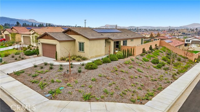 Tucked away on a quiet cul-de-sac, this corner-lot home offers a truly tranquil setting with scenic views in every direction. With an open floor plan and modern design throughout, the home feels light, airy, and effortlessly inviting. Neutral, contemporary colors paired with large windows create a soothing atmosphere filled with natural light and a sense of openness. The single-story layout features 9-foot ceilings, upgraded wood plank flooring, and recessed lighting throughout. The heart of the home is the beautifully designed kitchen with granite countertops, stainless steel appliances, a large island, walk-in pantry, and a modern one-touch faucet. Ideal for entertaining or gathering with family. The spacious living area flows seamlessly to the backyard, enhancing the indoor and outdoor lifestyle. The private backyard is a peaceful retreat, offering upgraded landscaping and stunning lake and San Jacinto mountain views. The primary suite provides a calming escape with a large walk-in closet and serene views, while the flexible floor plan includes a den with potential for a 4th bedroom and a mudroom with the option to convert into a third bathroom. Additional highlights include smart home features, EV charging capability, a two-car garage, ample parking, and one of the best lots in the neighborhood. Located near three community parks and close to Launch Pointe for boating, dining, and outdoor recreation, this home blends modern comfort with a peaceful, resort-like setting.