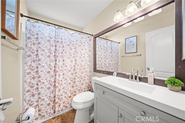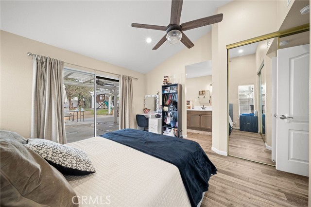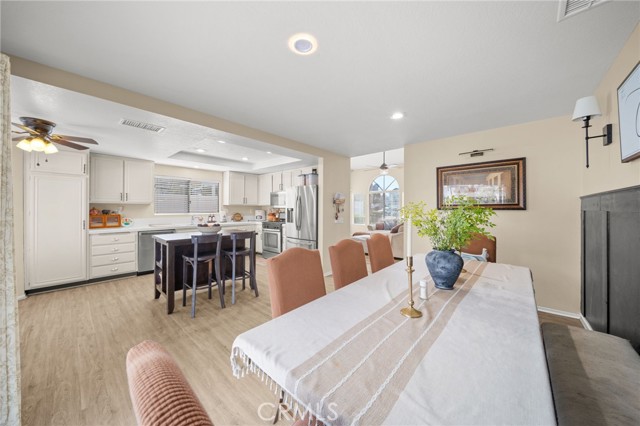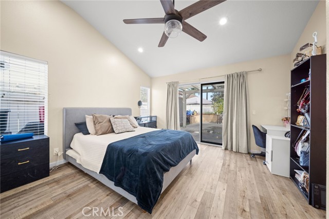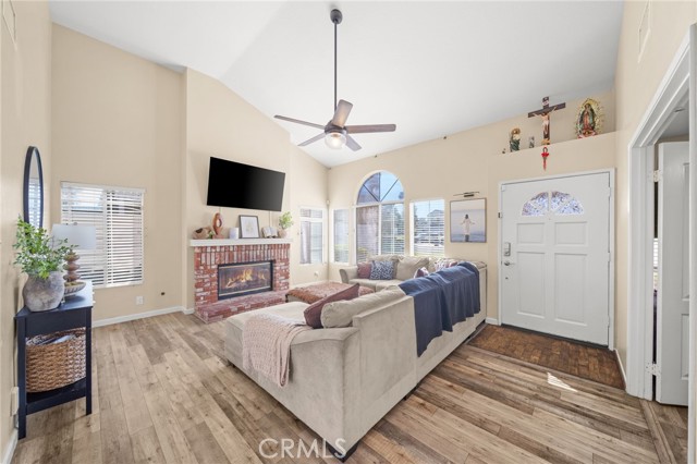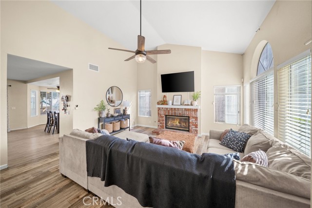 Welcome to this beautifully maintained home located in the desirable Menifee Lakes community. The light-filled living room features high ceilings, laminate wood flooring, and a cozy gas fireplace. The kitchen overlooks the spacious backyard, providing an ideal layout for everyday living and entertaining. The primary bedroom offers vaulted ceilings, dual mirrored closet doors, and a recently renovated ensuite bathroom, along with direct access to the backyard patio through a sliding glass door. Two additional secondary bedrooms include mirrored closet doors, with one featuring a double-door entry—ideal for guests, an office, or a flex space. Additional highlights include laminate wood flooring throughout, newer central air conditioning, ceiling fans in all rooms, epoxy-coated garage flooring, mature backyard trees, and a long driveway providing ample parking. Residents enjoy access to community amenities including a pool, walking trails, and neighborhood events. Menifee Lakes is within walking distance and offers recreational opportunities such as hiking, biking, and fishing.