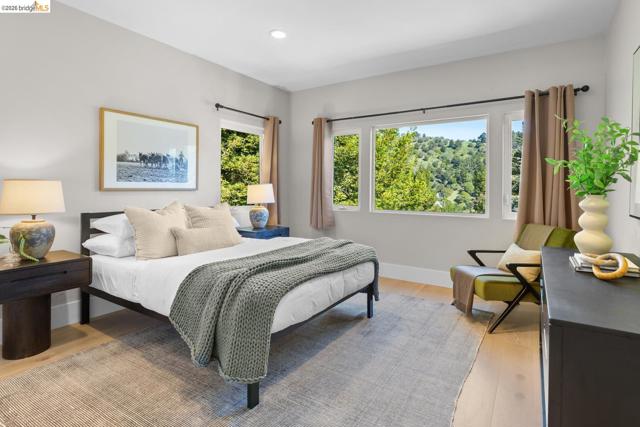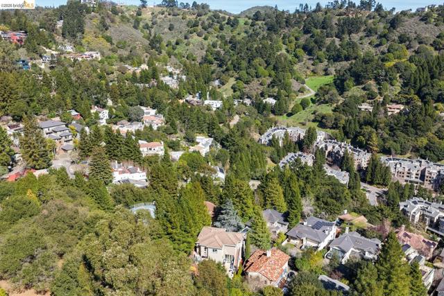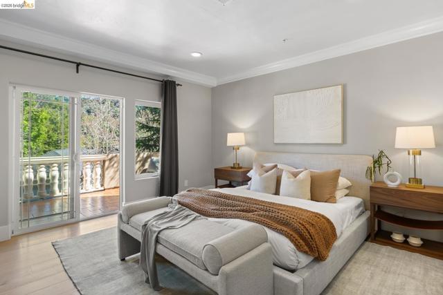 Tucked into the sought-after Claremont Hills, this stunning modern Mediterranean, built in 2006, offers more than 3,500 sq. ft. of refined living, with bay and canyon views from four balconies and surrounded by beautifully designed outdoor spaces ideal for entertaining or relaxation. Thoughtfully crafted with comfort and elegance in mind, this sanctuary features elevator access from the attached two-car garage to both the private guest suite and the main living levels. The airy open-concept design seamlessly connects the living and dining areas to the updated kitchen. A private balcony extends the space outdoors and showcases sweeping hillside views. The lower level includes a private ensuite bedroom perfect for guests or extended family. Upstairs, three spacious bedrooms await, including a luxurious primary retreat complete with its own balcony and an expansive walk-in closet. Plus, the den area provides additional space. Outdoors, unwind beside the fireplace lounge and dining area while enjoying Bay views, an exceptional setting for intimate evenings and memorable gatherings. Peacefully removed from the bustle yet conveniently close to Highways 24 and 13, the Claremont Hotel & Club, and miles of scenic trails, this dream offers the perfect blend of serenity and accessibility.