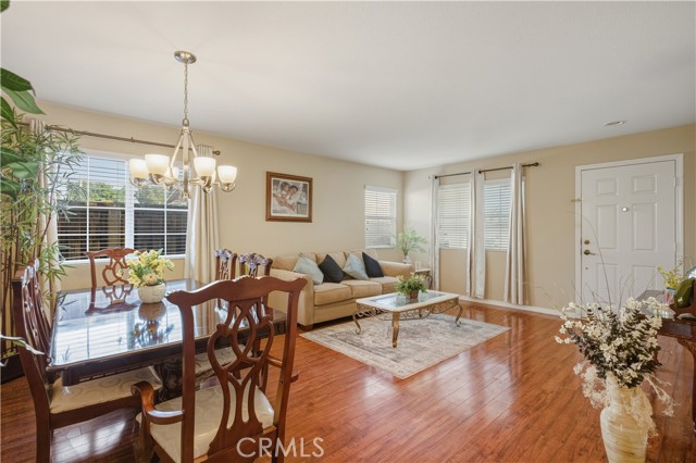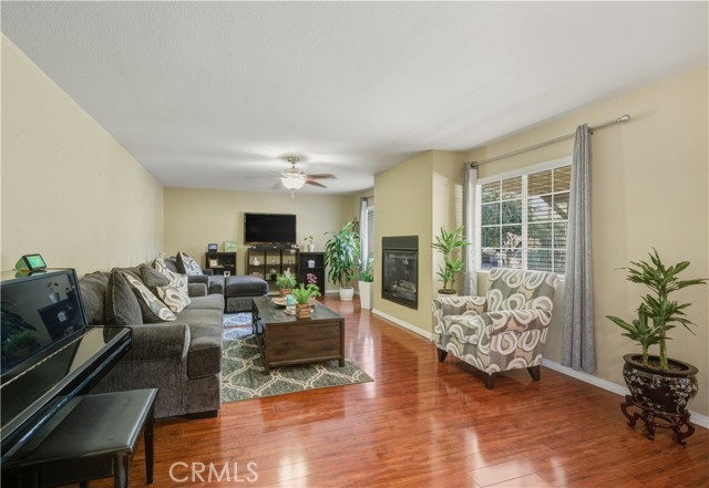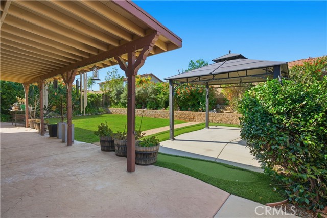 Featuring 3,206 square feet of living space, this 5 bedroom, 3 bathroom home is tucked within a cul-de-sac and includes a 3-car garage. Built in 2006 with a low HOA of $78 per month, the home features fresh interior paint and new flooring in the kitchen, giving it a clean, updated feel. The kitchen is open to the family room, creating a comfortable space for everyday living and gatherings. A downstairs bedroom, ideal for guests, extended family, or a private office, sits just across from a full bathroom with a walk-in shower. Upstairs, you’ll find generously sized secondary bedrooms, a spacious loft ideal for a game room, media space, or additional entertaining area, and a convenient upstairs laundry room. The primary suite is extra large and features an oversized walk-in closet with plenty of room for storage and organization. The 7,841 square foot lot offers a backyard designed for entertaining, complete with a covered patio, stamped concrete, gazebo, and a small putting green. Centrally located near the 15 freeway, shopping, and schools, this home offers space and flexibility in a cul-de-sac setting.